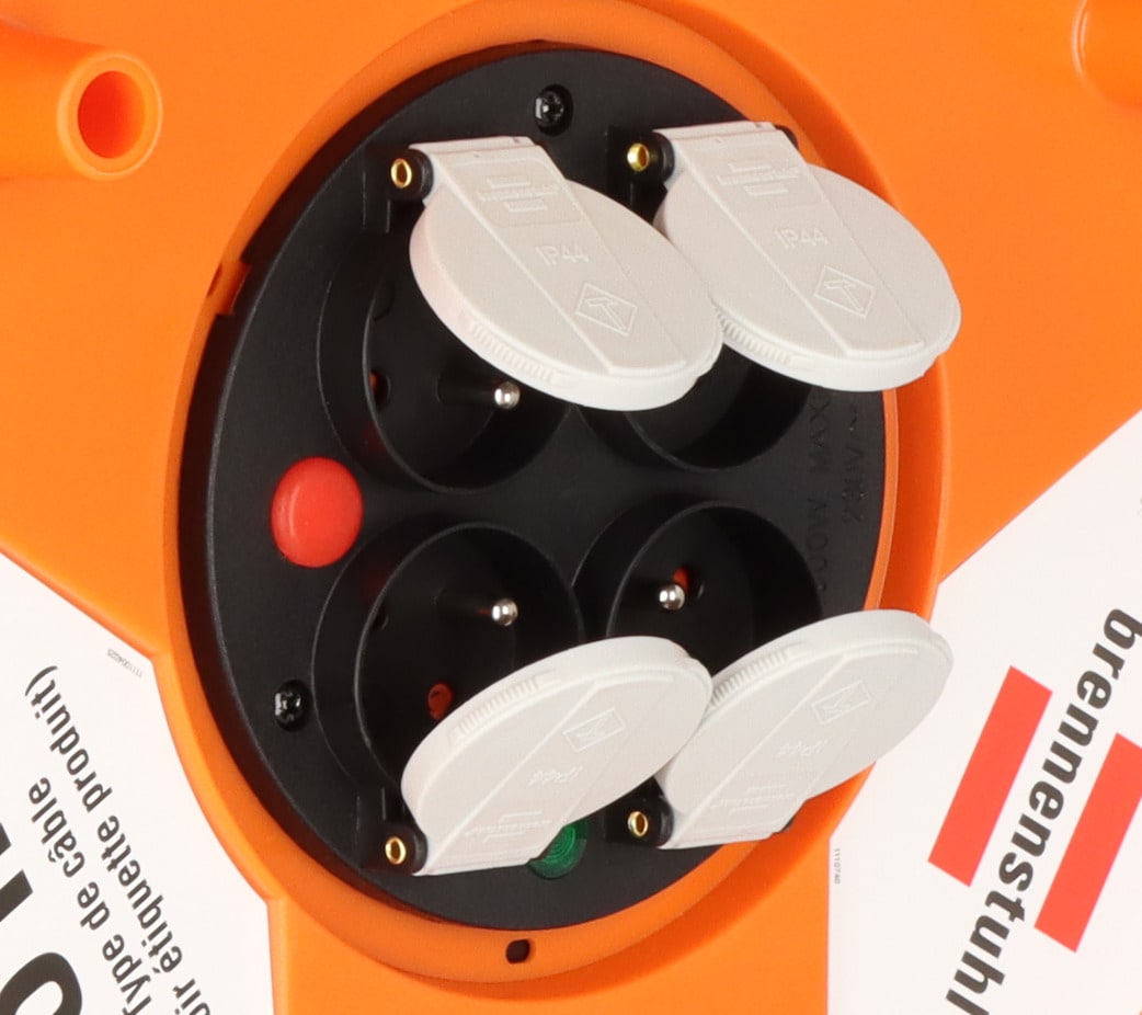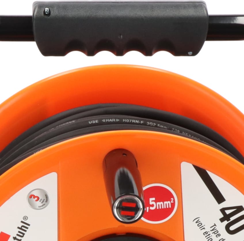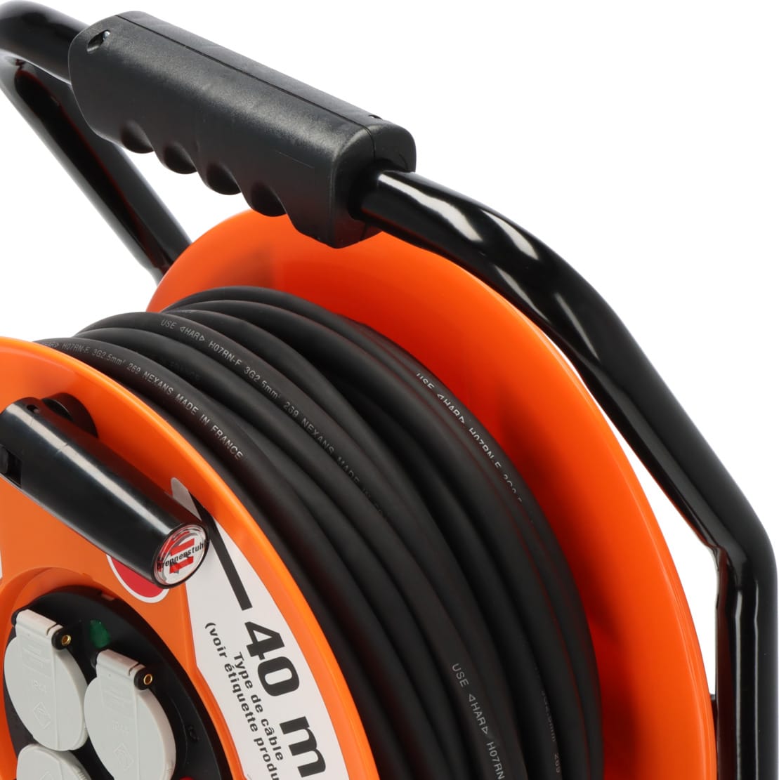 L'enrouleur de câble Garant® SP de brennenstuhl® est équipé de 40m de câble H07RN-F 3G2,5 offrant une grande souplesse de travail. Ce dérouleur électrique est équipé d'un bloc avec 4 prises de courant, d'un disjoncteur et d'un voyant de présence de tensio
