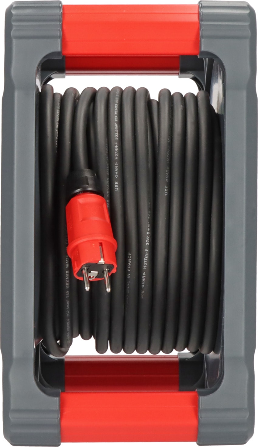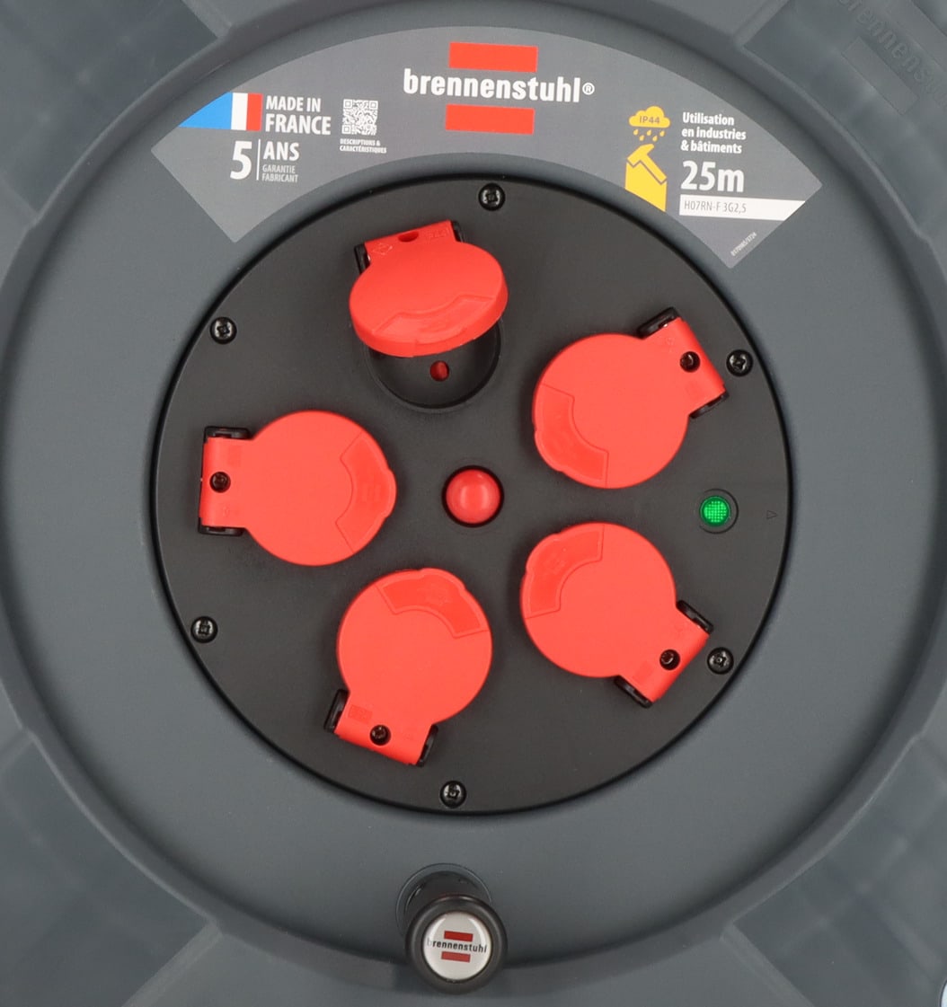 L’enrouleur de câble KA 2201 5 Professional de brennenstuhl® dispose de 25m de câble H07RN-F 3G2,5. Ce dérouleur électrique est doté de 5 prises de courant 2P+T 16A/230V~ avec clapets à fermeture automatique muni d'un disjoncteur thermique central et d'u