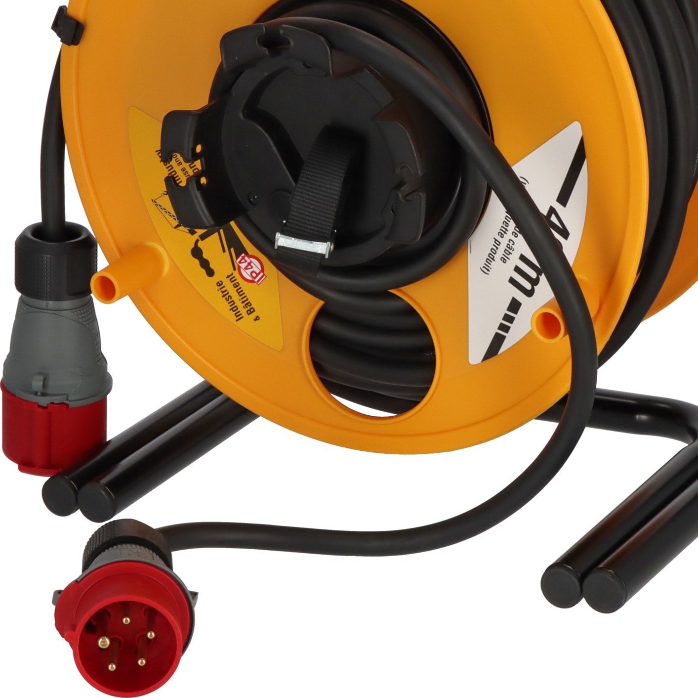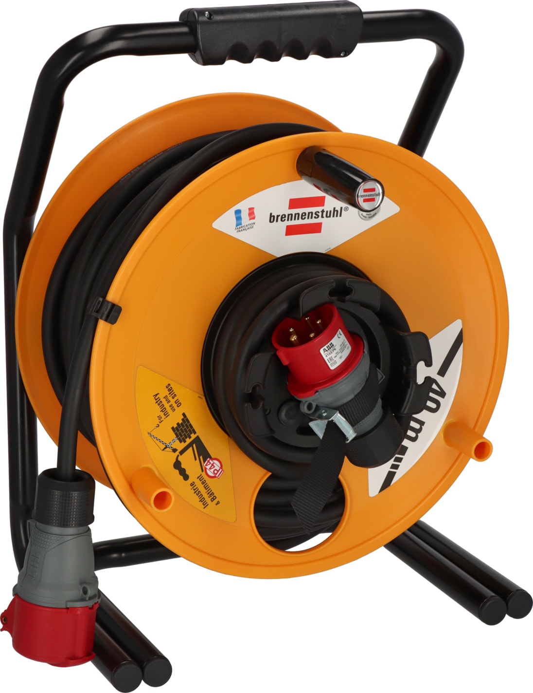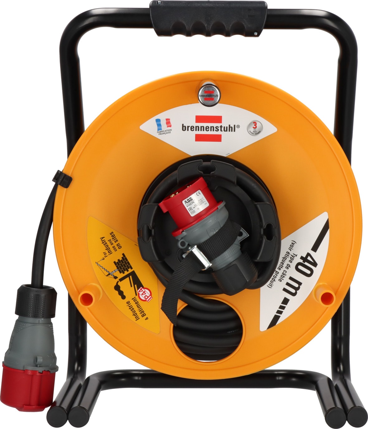 L'enrouleur de câble Maxi Garant CEE de brennenstuhl® est équipé de 40m de câble H07RN-F 5G2,5 composé de 38,5m de cordon d'alimentation et d'une rallonge électrique de 1,5m. D'autre part, ce dérouleur a été développé avec une prise CEE 16A/415V avec clap