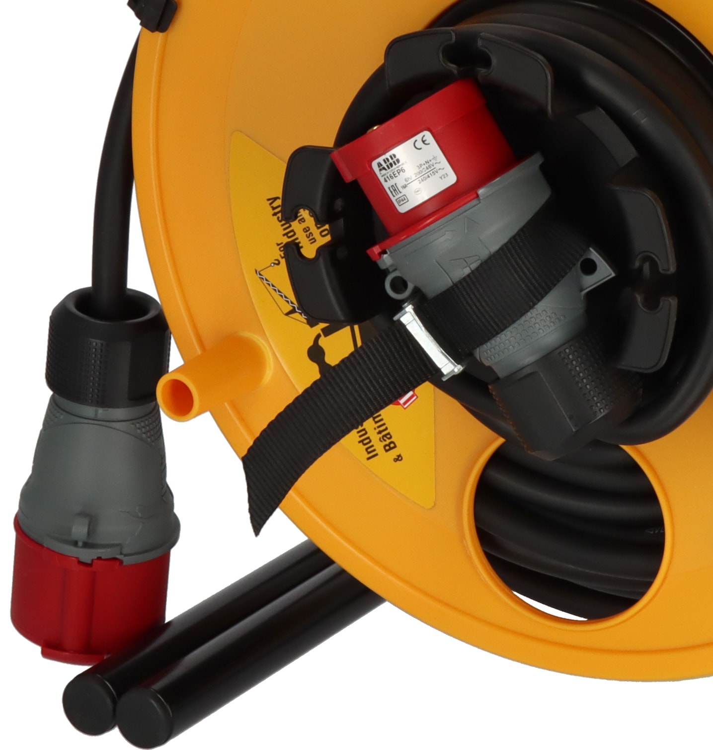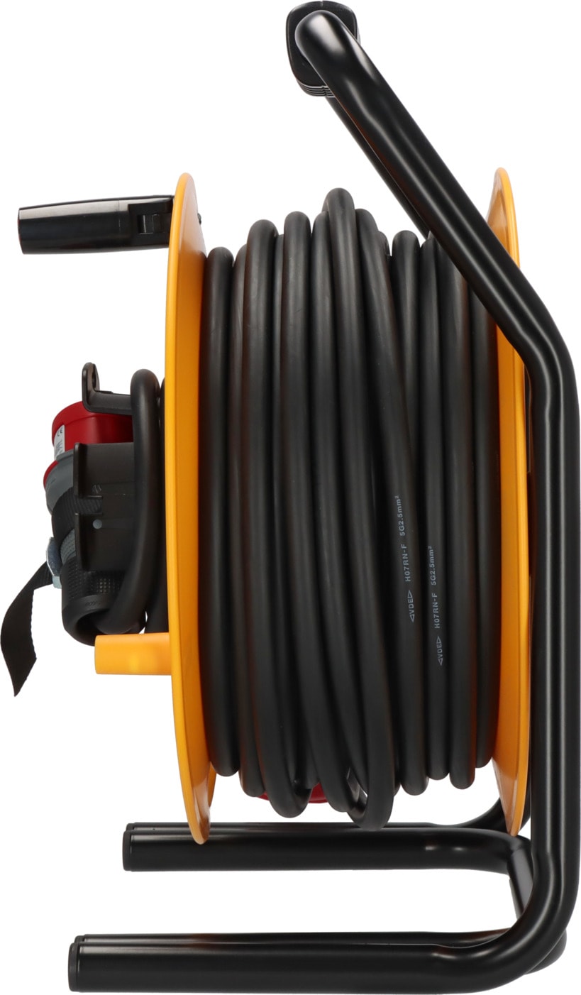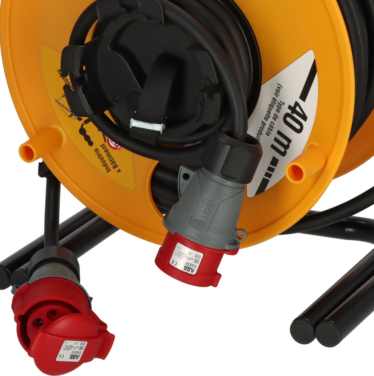L'enrouleur de câble Maxi Garant CEE de brennenstuhl® est équipé de 40m de câble H07RN-F 5G2,5 composé de 38,5m de cordon d'alimentation et d'une rallonge électrique de 1,5m. D'autre part, ce dérouleur a été développé avec une prise CEE 16A/415V avec clap