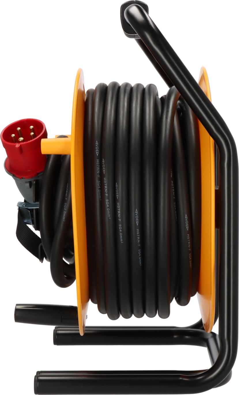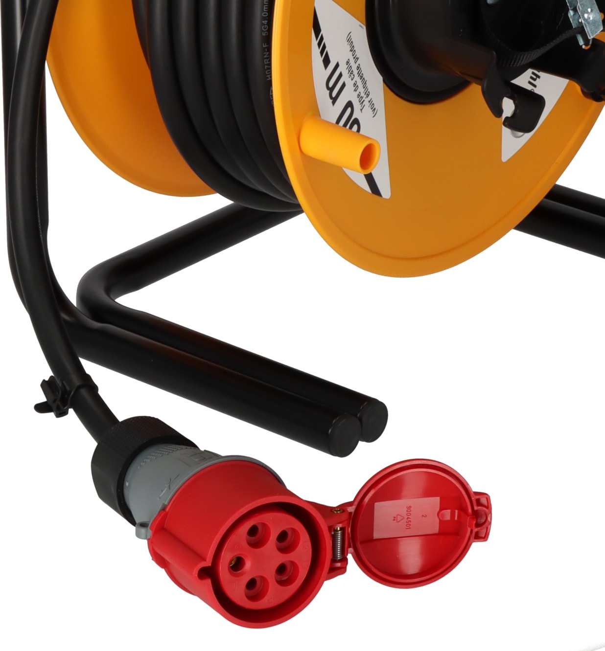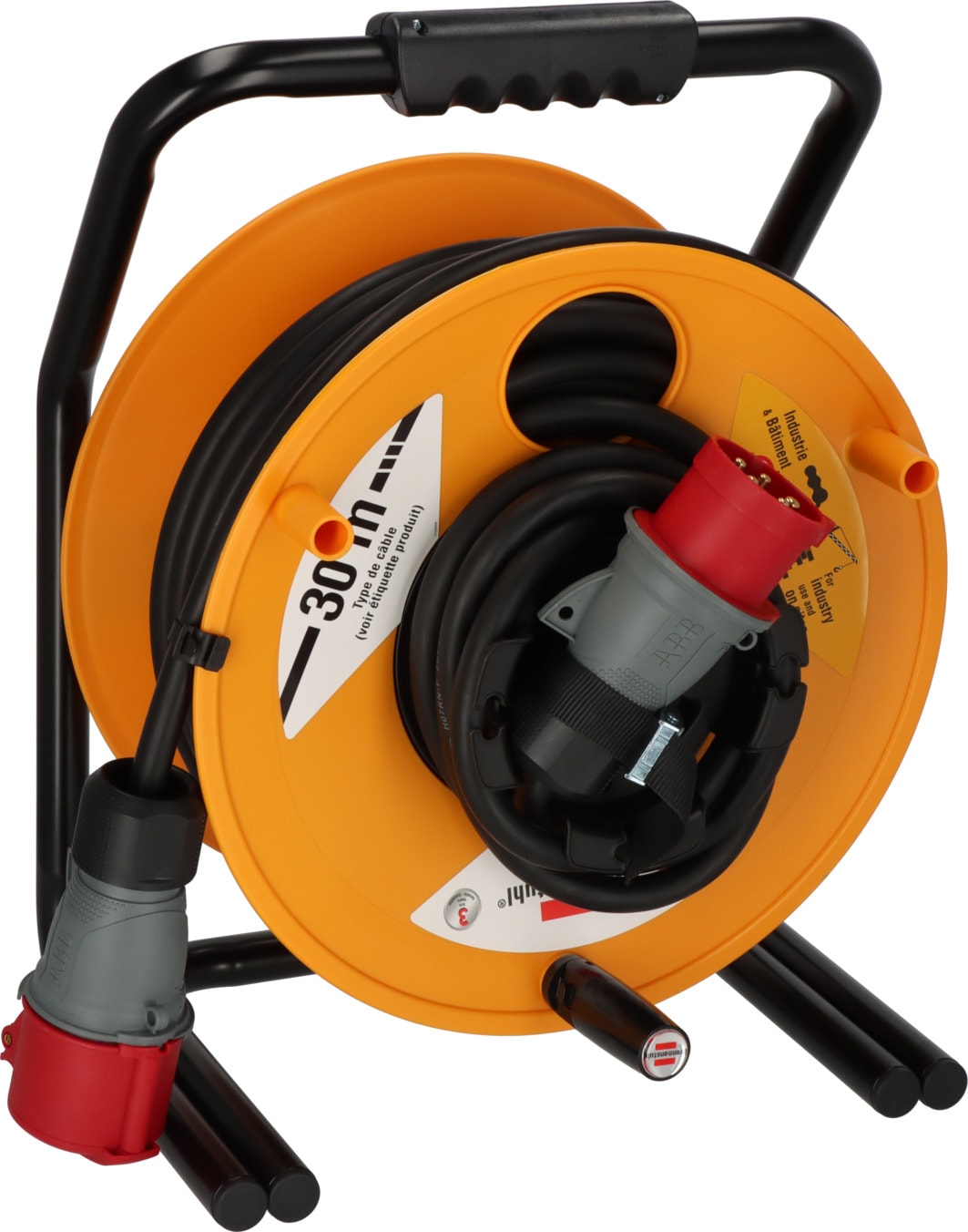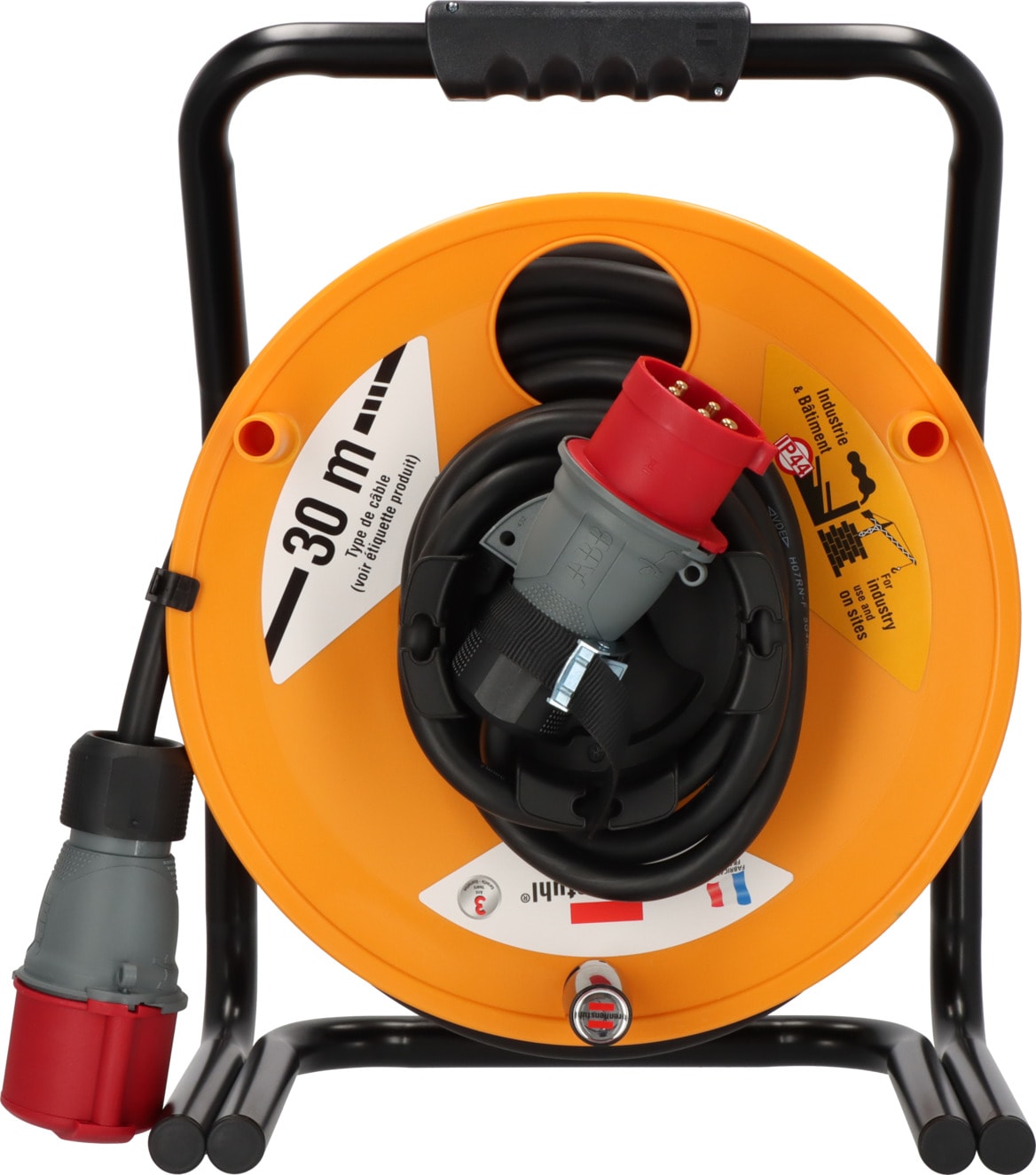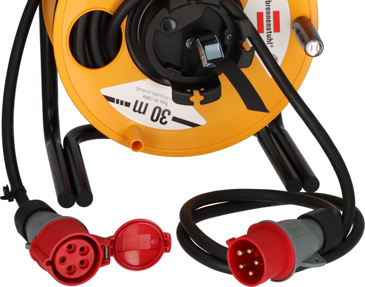 L'enrouleur de câble Maxi Garant CEE de brennenstuhl® est équipé de 30m de câble H07RN-F 5G4,0 composé de 28,5m de cordon d'alimentation et d'une rallonge électrique de 1,5m. D'autre part, ce dérouleur a été développé avec une prise CEE 32A/415V avec clap
