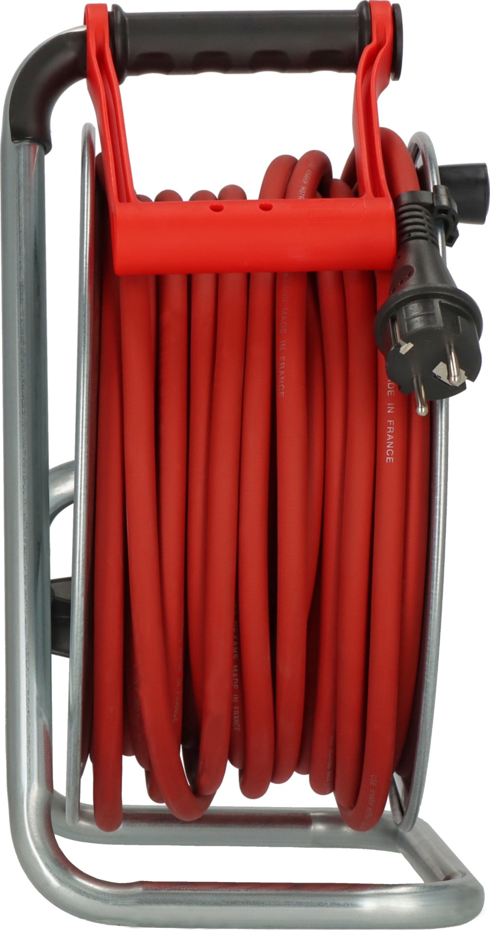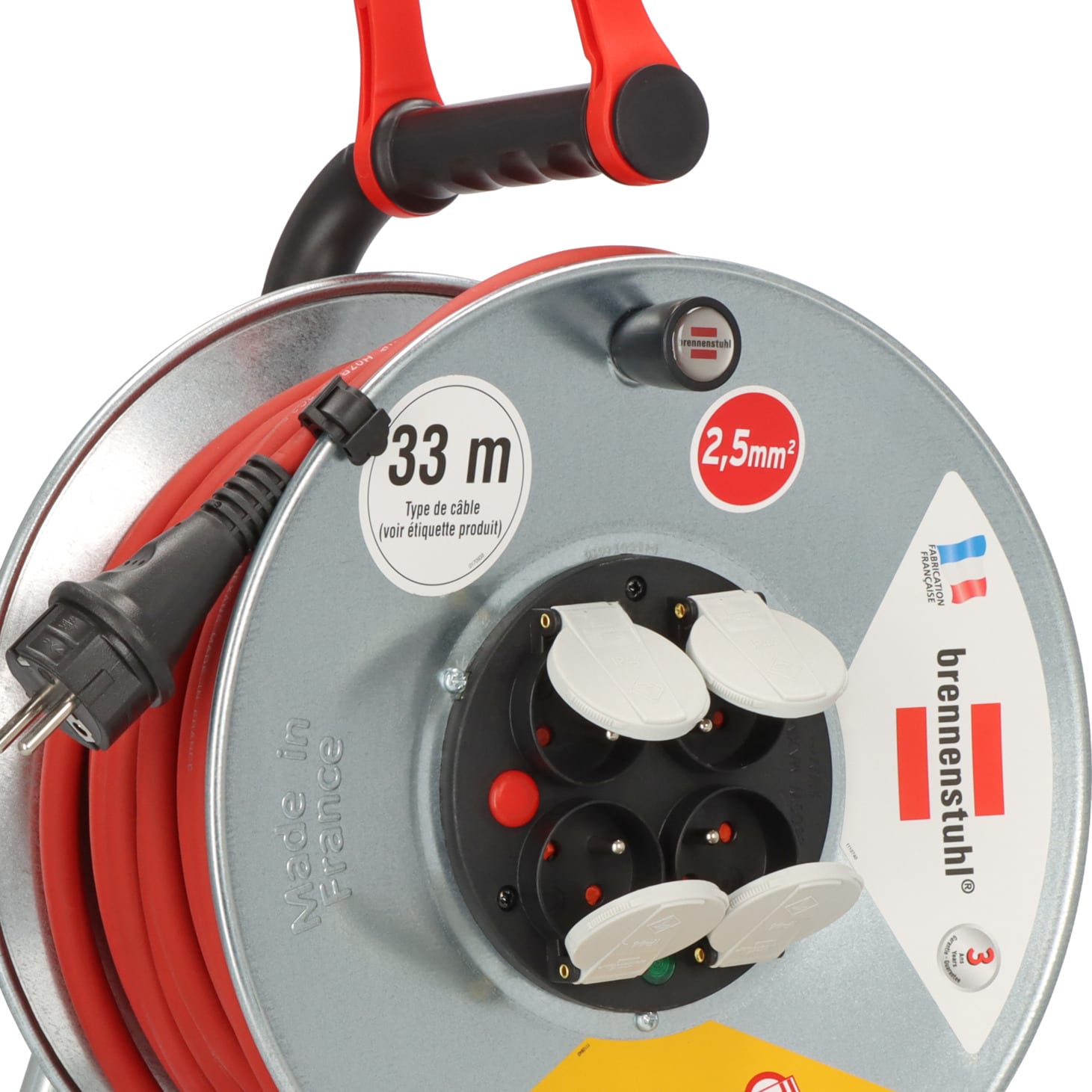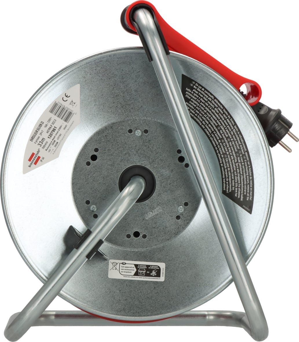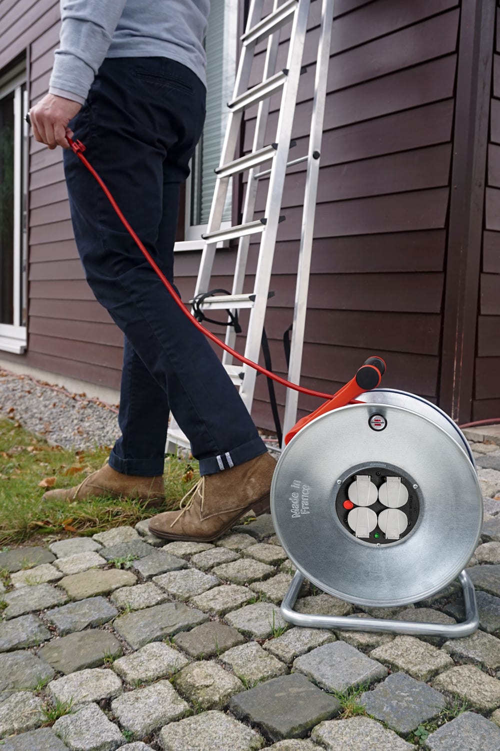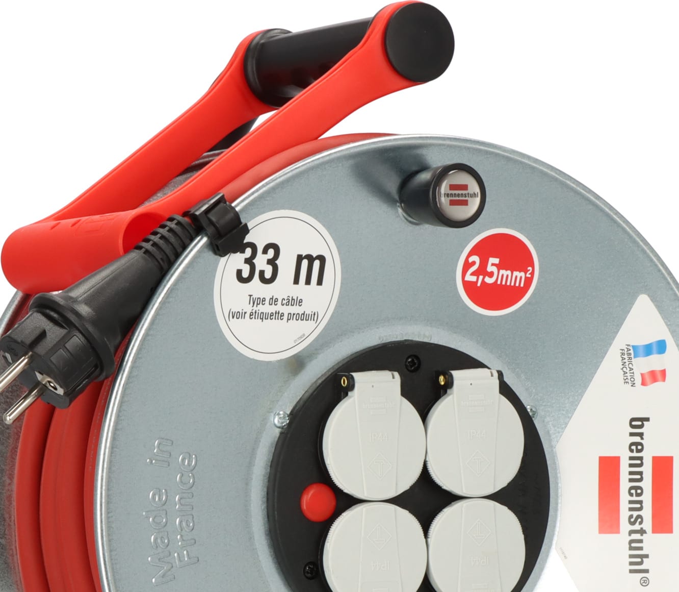L'enrouleur de câble SILVER-33 de brennenstuhl®, 33m H07RN-F, est doté de quatre prises de courant avec clapets, un voyant de présence de tension LED et un disjoncteur. Le support et les flasques en acier galvanisé reflètent toute la robustesse de cet enr