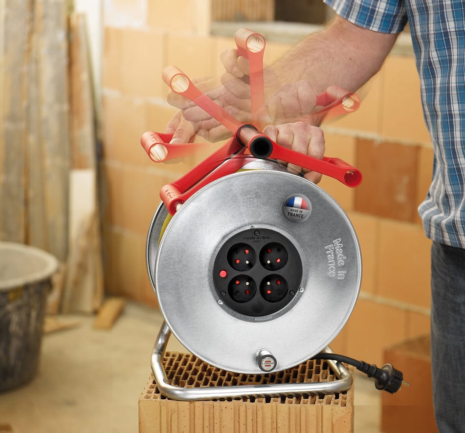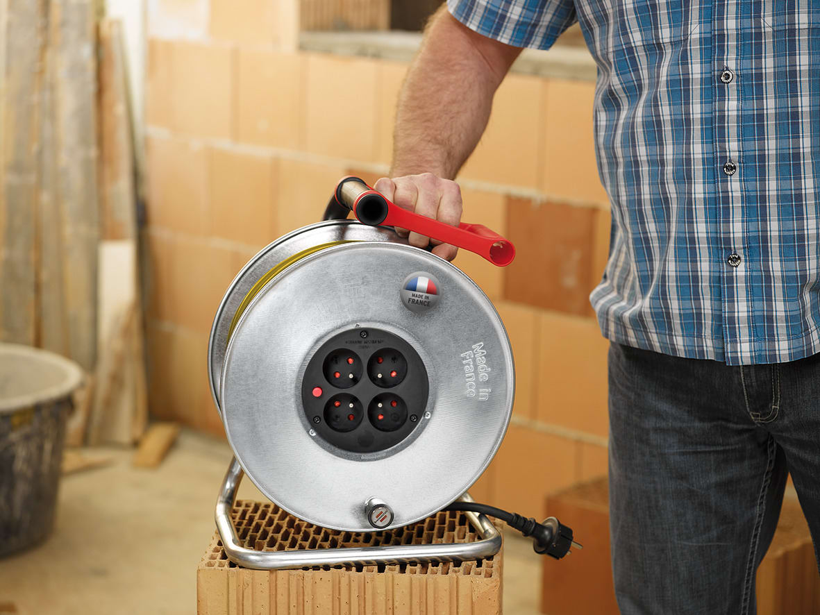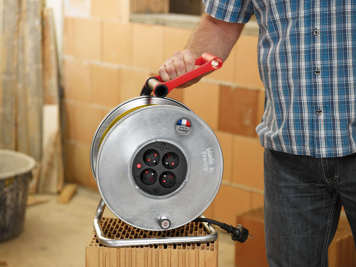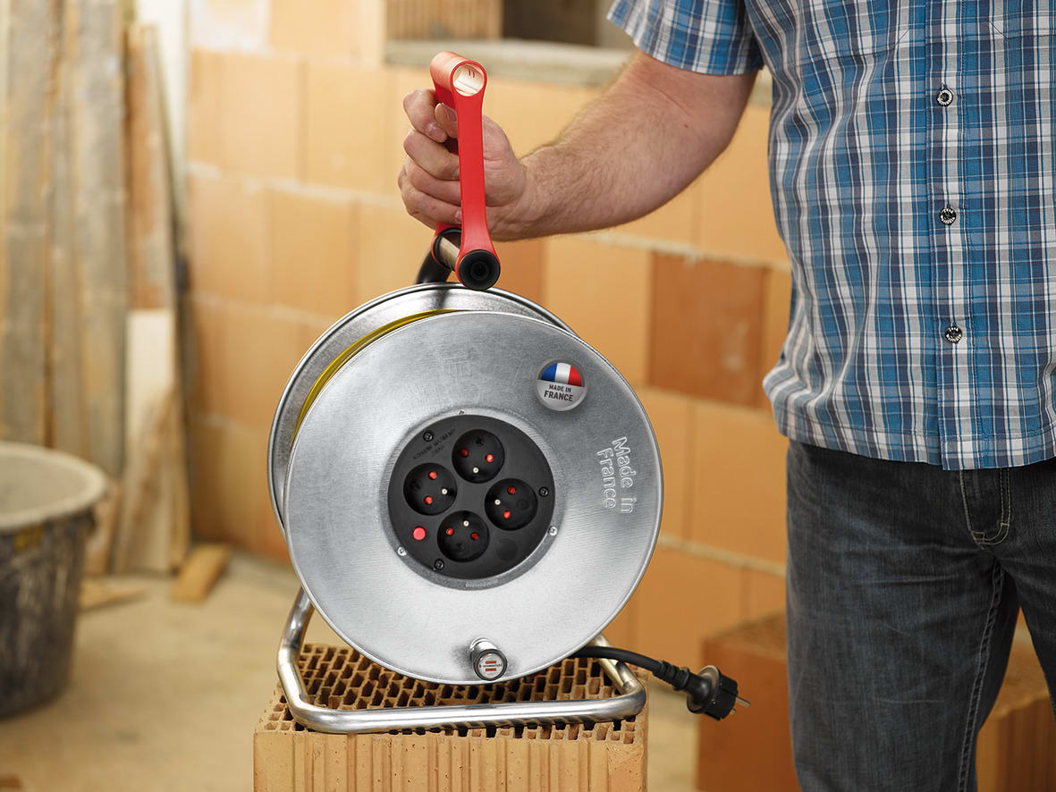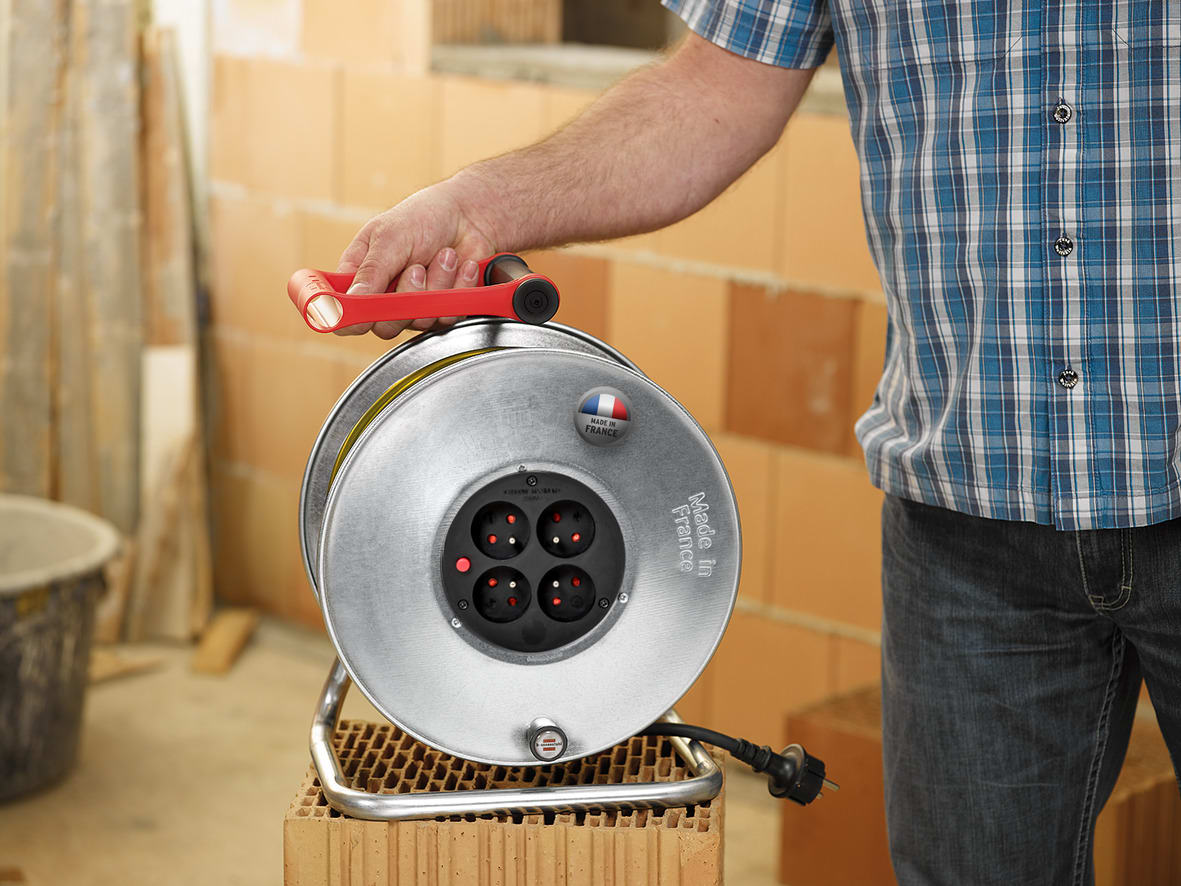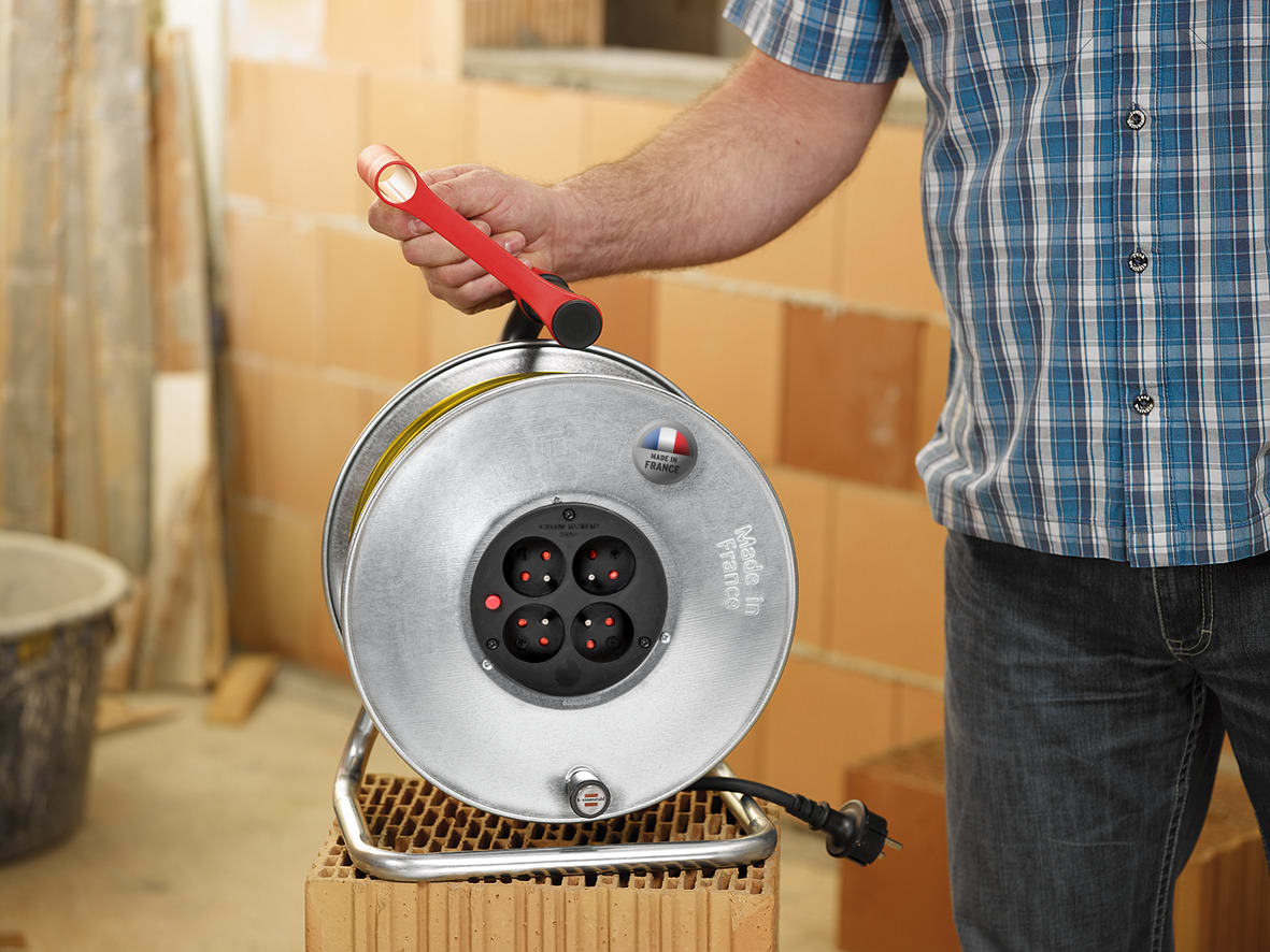 L'enrouleur de câble SILVER BRICO-330 de brennenstuhl®, 33m H05VV-F, est doté de 4 prises de courant électrique et d'un disjoncteur thermique. Le support et les flasques en acier galvanisé, le bouton tournant et la poignée basculante "cablepilot" reflèten