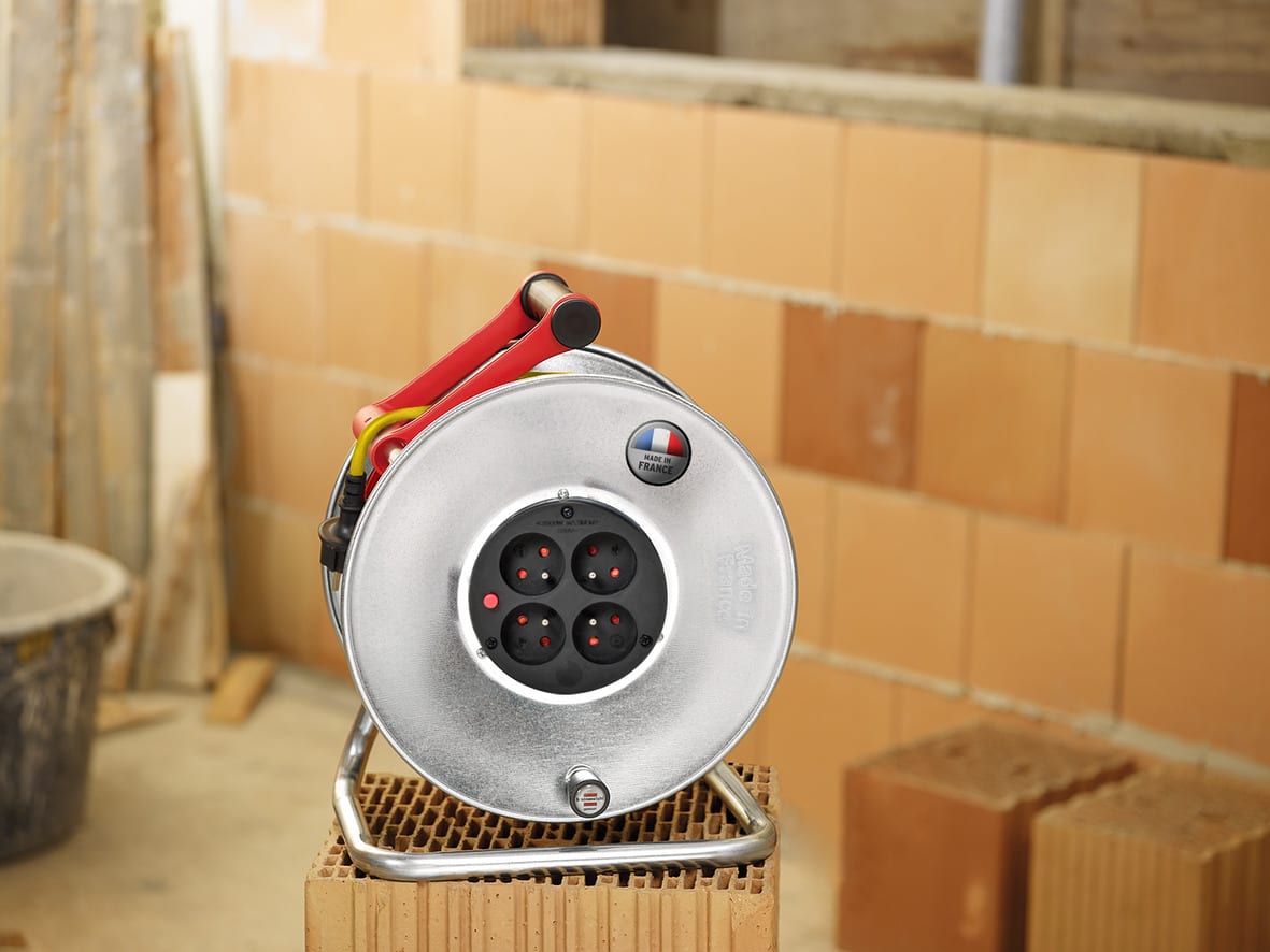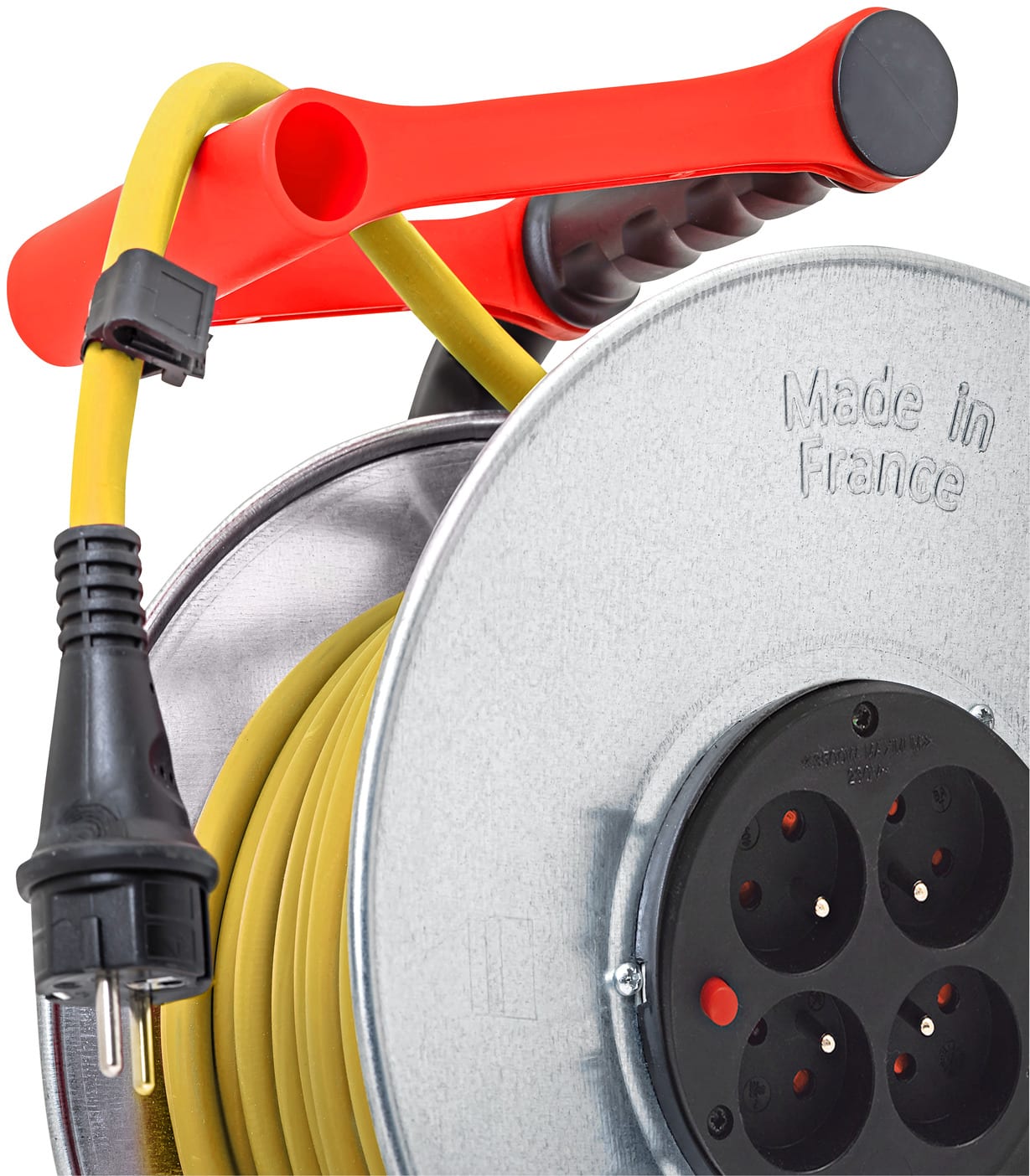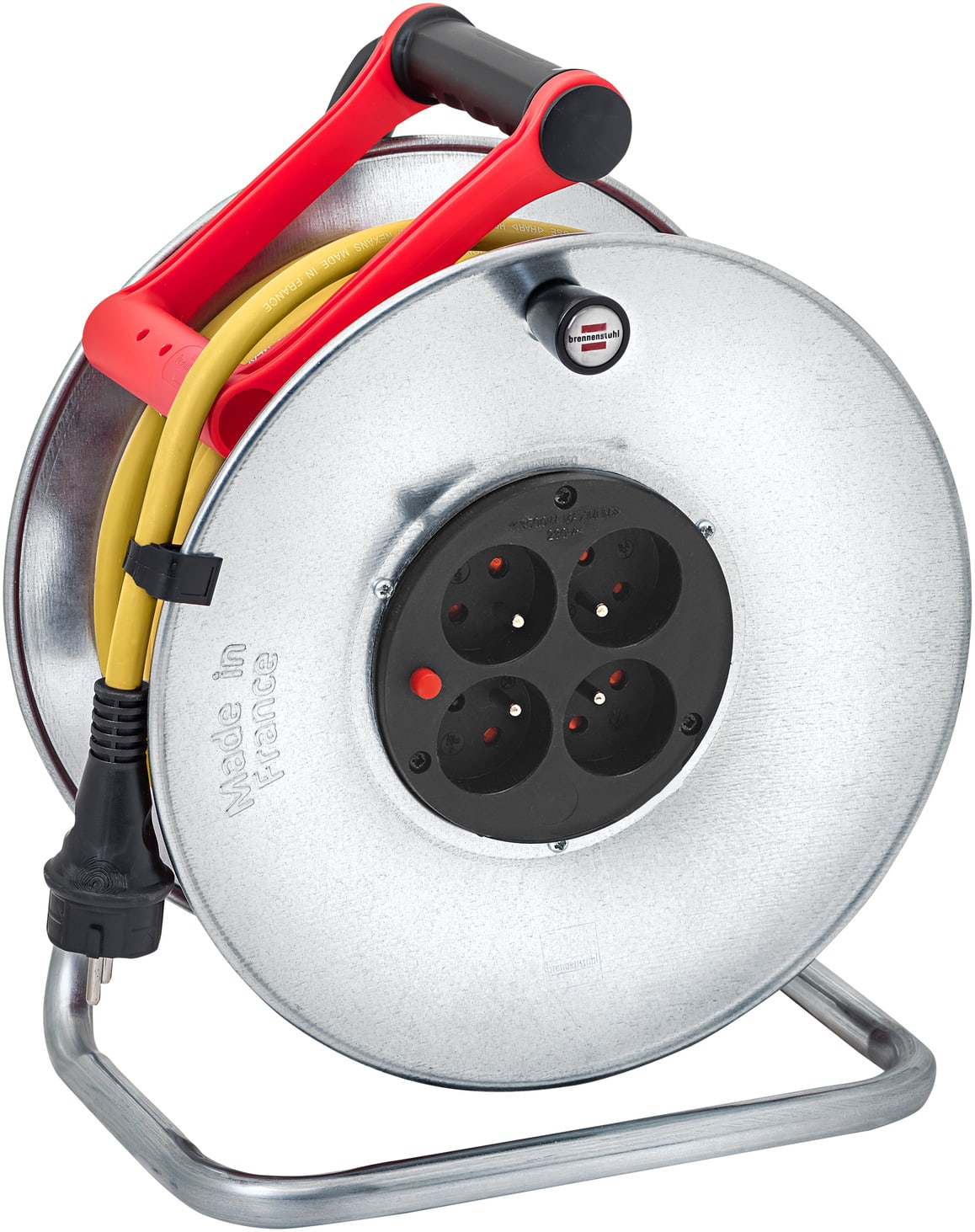 Brennenstuhl Enrouleur de câble SILVER BRICO-330 / Enrouleur électrique (4 prises, flasques en acier galvanisé, disjoncteur, poignée cablepilot, frein, clip, 33m H05VV-F), fabriqué en France