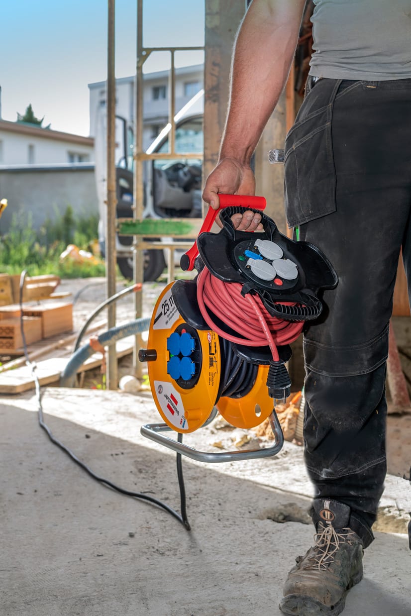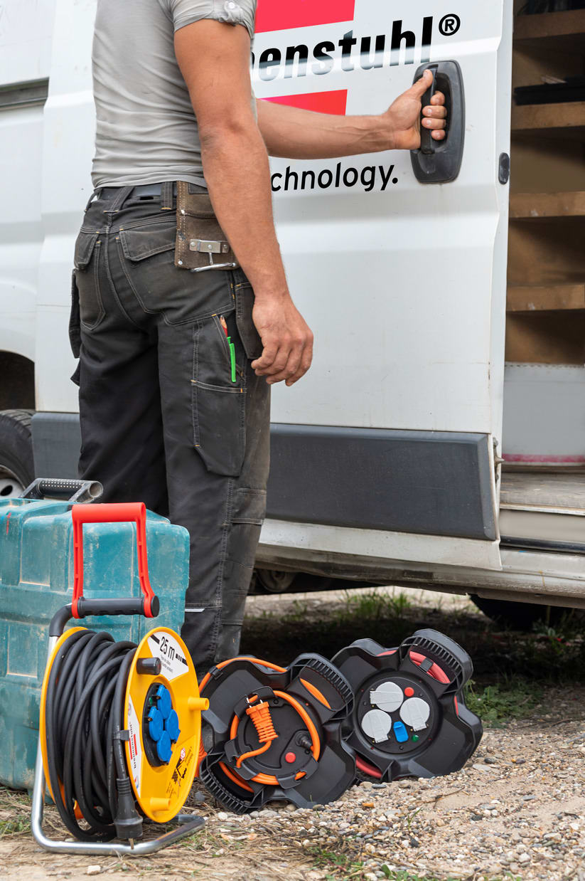 L'enrouleur de câble Standard PRO de brennenstuhl® dispose de 25m de câble H07RN-F, résistant aux hydrocarbures et d'un voyant de présence de tension. La poignée "cablepilot" de ce dérouleur facilite le transport, rend possible l'accroche et guide le câbl