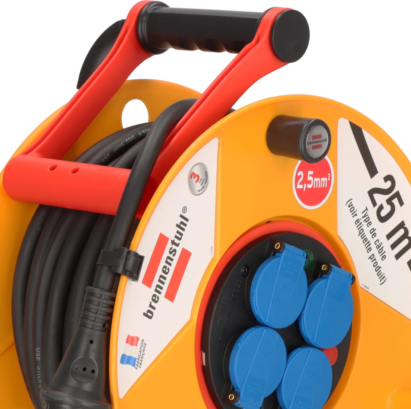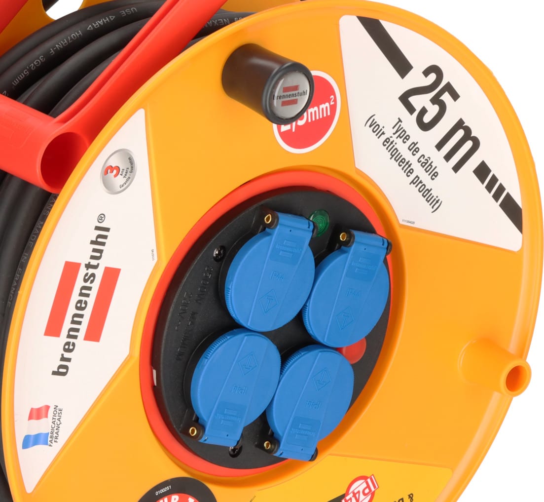 Brennenstuhl Enrouleur de câble Standard RB PRO/ Enrouleur électrique avec technologie Bretec (4 prises, voyant de tension, contact tournant, poignée, 25m H07RN-F, en extérieur) fabriqué en France