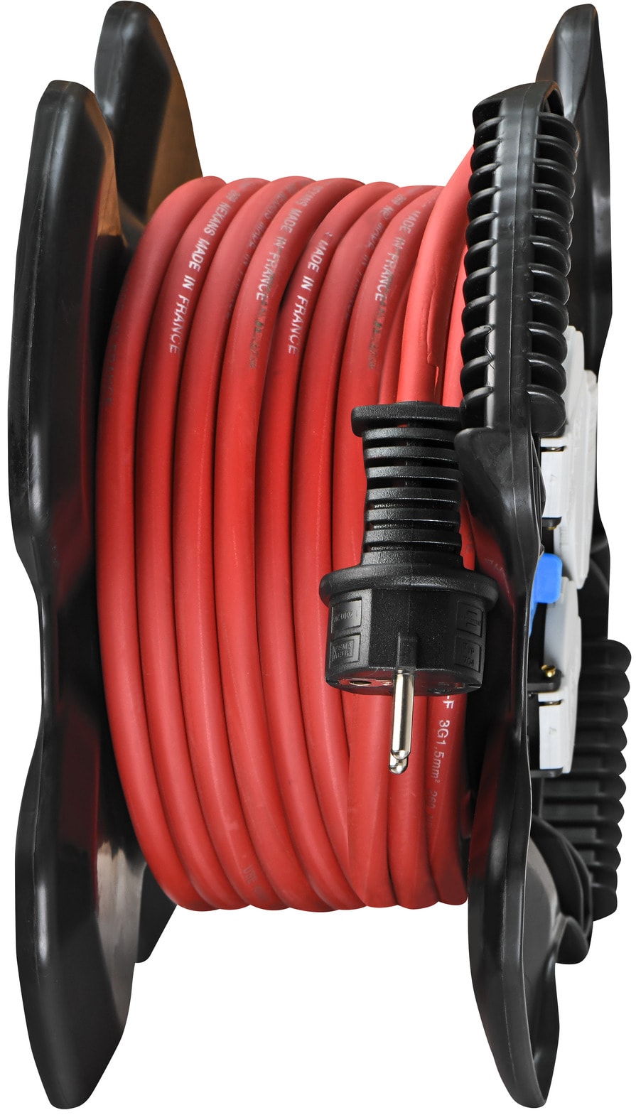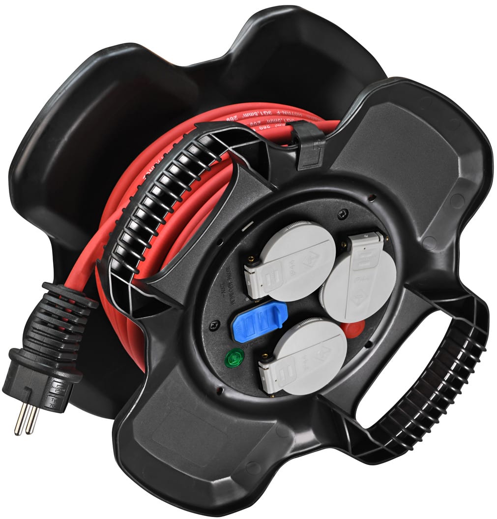 Brennenstuhl Enrouleur de câble compact X-GUM / Enrouleur électrique souple (3 prises avec clapets, 2 ports USB, voyant de présence de tension, 10m H07RN-F 3G1,5, en extérieur) fabriqué en France