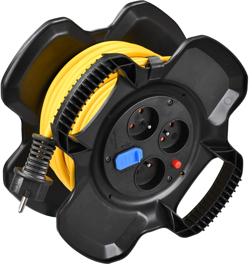 Brennenstuhl Enrouleur de câble compact X-GUM / Enrouleur électrique souple (3 prises, 2 ports USB, 15m H05VV-F 3G1,5 jaune, disjoncteur, en intérieur) fabriqué en France