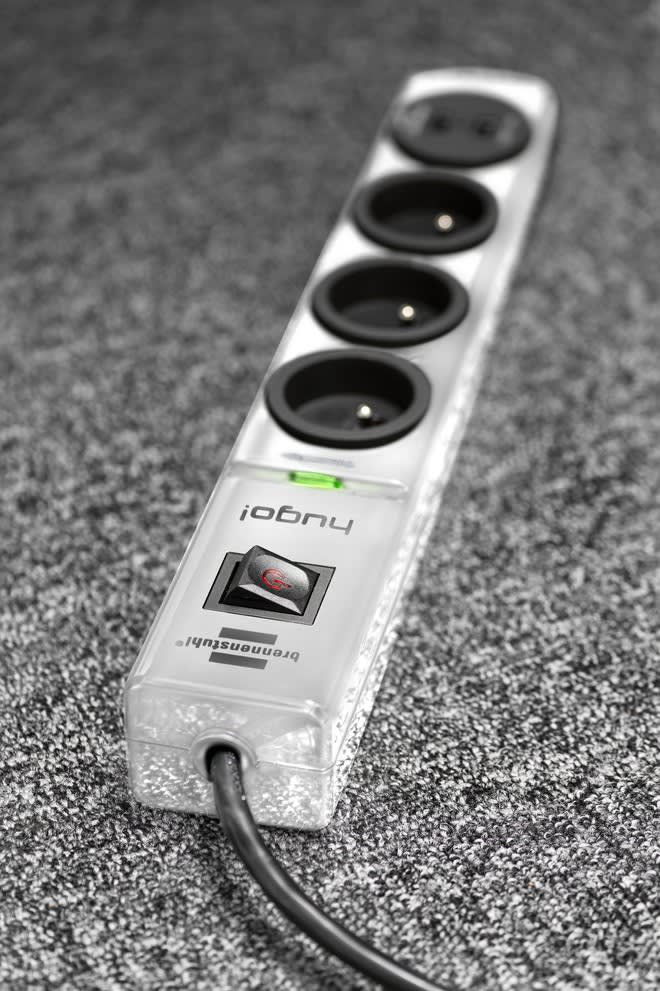 La multiprise hugo! de brennenstuhl au design sobre et élégant allie esthétique et robustesse. Elle dispose d’œillets de fixation pour montage mural et de 2m de câble. Cette multiprise est également équipée de parasurtenseur protégeant vos appareils co Bloc multiprise protège les composants électroniques contre les parasites générés par les tensions de haute fréquence Multiprise doté de 2m de câble H05VV-F 3G1,5 avec prises de courant orientées à 45°, pratique pour les fiches coudées Boîtier du bloc multiprise équipé d'œillets de fixation permettant un montage mural Rallonge multiprises équipée de 2 ports USB, d'un parasurtenseur avec témoin LED de protection active et d'un interrupteur marche/arrêt à voyant lumineux