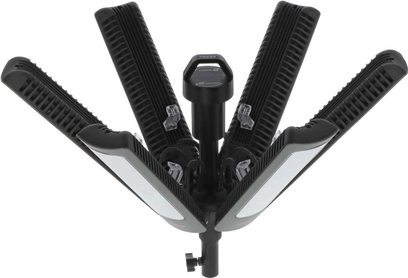 Le projecteur de chantier LED 360° R42050 BT de brennenstuhl® Professional est idéal pour éclairer des chantiers, des espaces clos ou des halls. Le projecteur est équipé de six panneaux LED dont chacun peut être ajusté individuellement pour obtenir la pos
