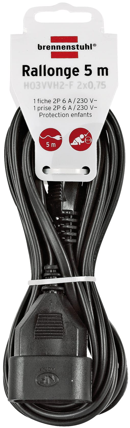 La rallonge électrique de brennenstuhl® bénéficie d'une longueur de câble exceptionnelle de 3 mètres en noir. La rallonge est équipée d'une fiche Euro plate (2P 6A/230V~) et d'une prise Euro plate (2P 6A/230V~). Ce cordon électrique est adapté à une utili