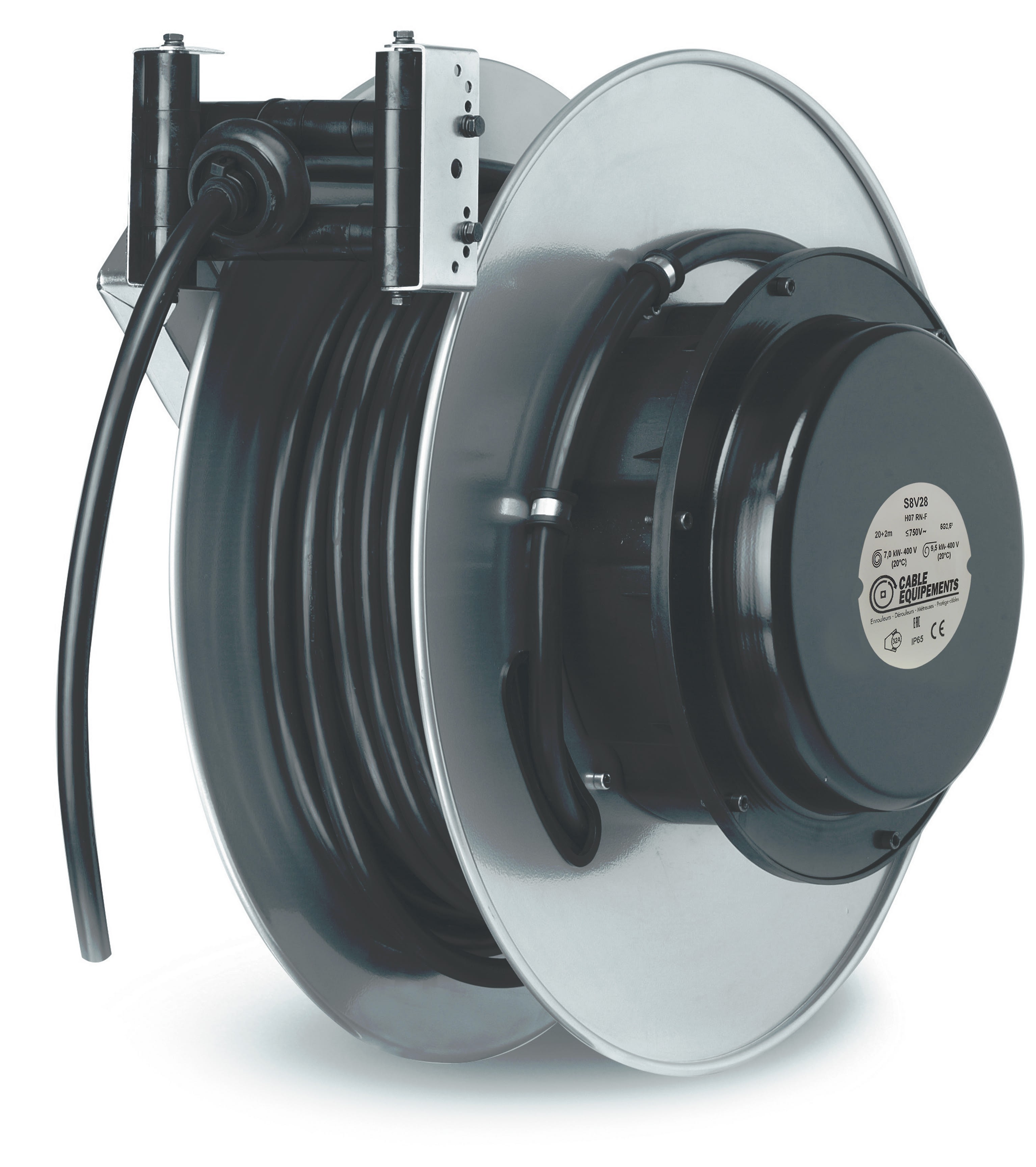Enrouleur automatique - 20+2m 5G2,5² H07RN-F -Bride pivotante et guidage/cliquet - IP65 si installation conforme - Enroulé 7kW déroulé 10kW - Collecteur 32A -Si usage vertical, choisir S8V28-F - Carter ouvert acier/alu type STEEL 800 -