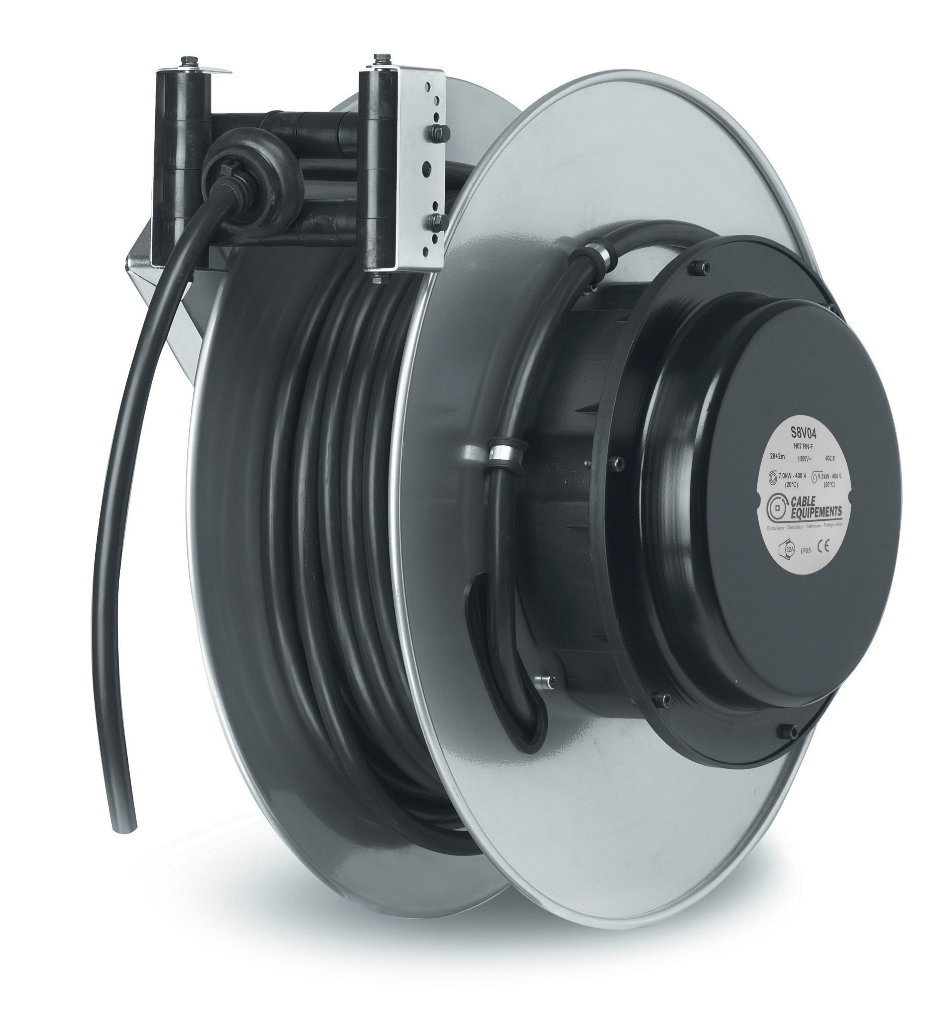 Enrouleur automatique - 29+2m 4G2,5² H07RN-F -Bride pivotante et guidage/cliquet - IP65 si installation conforme - Enroulé 7 kW déroulé 10 kW - Collecteur 32A -Si usage vertical, choisir S8V04-F - Carter ouvert acier/alu type STEEL 800 -