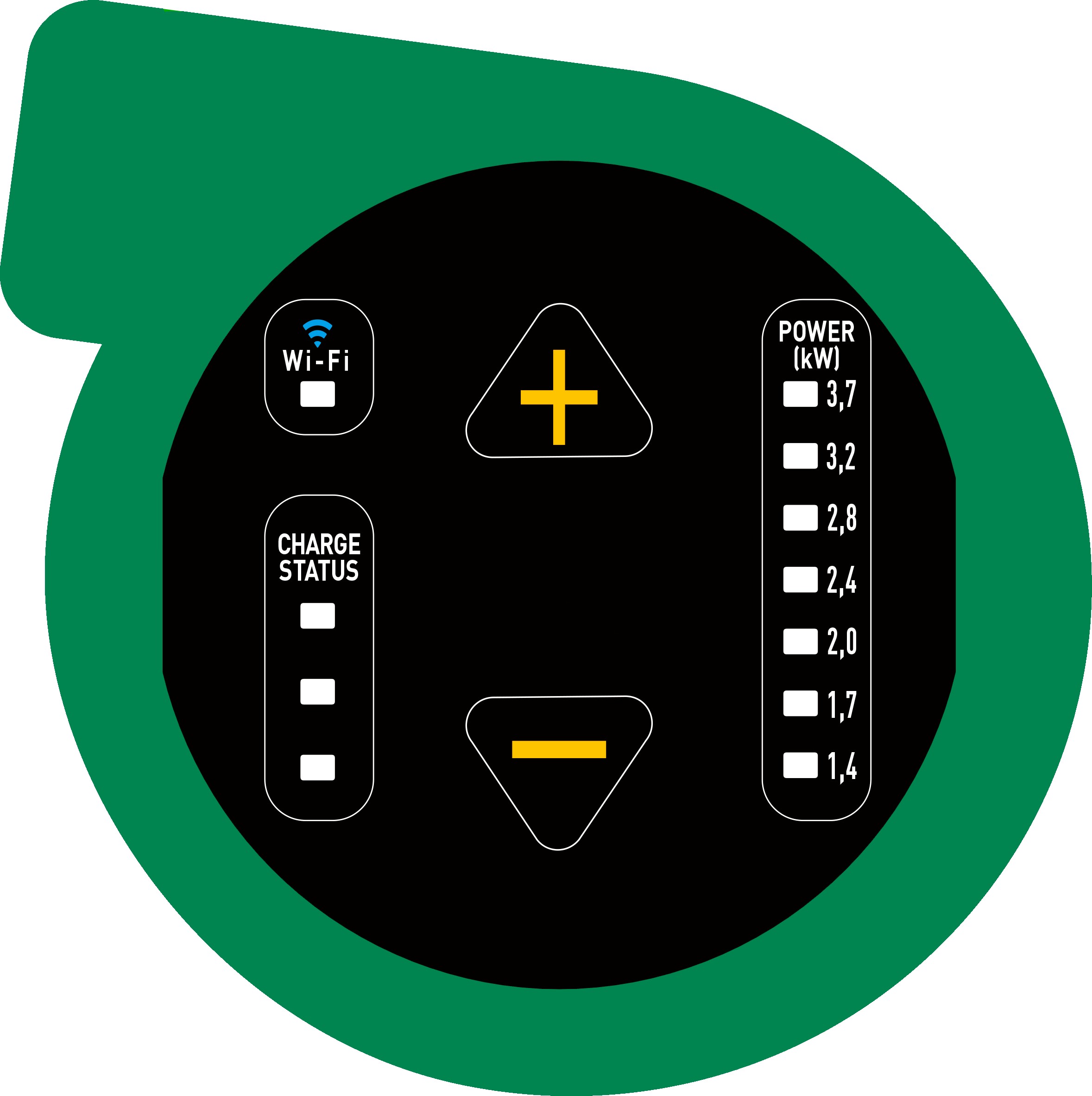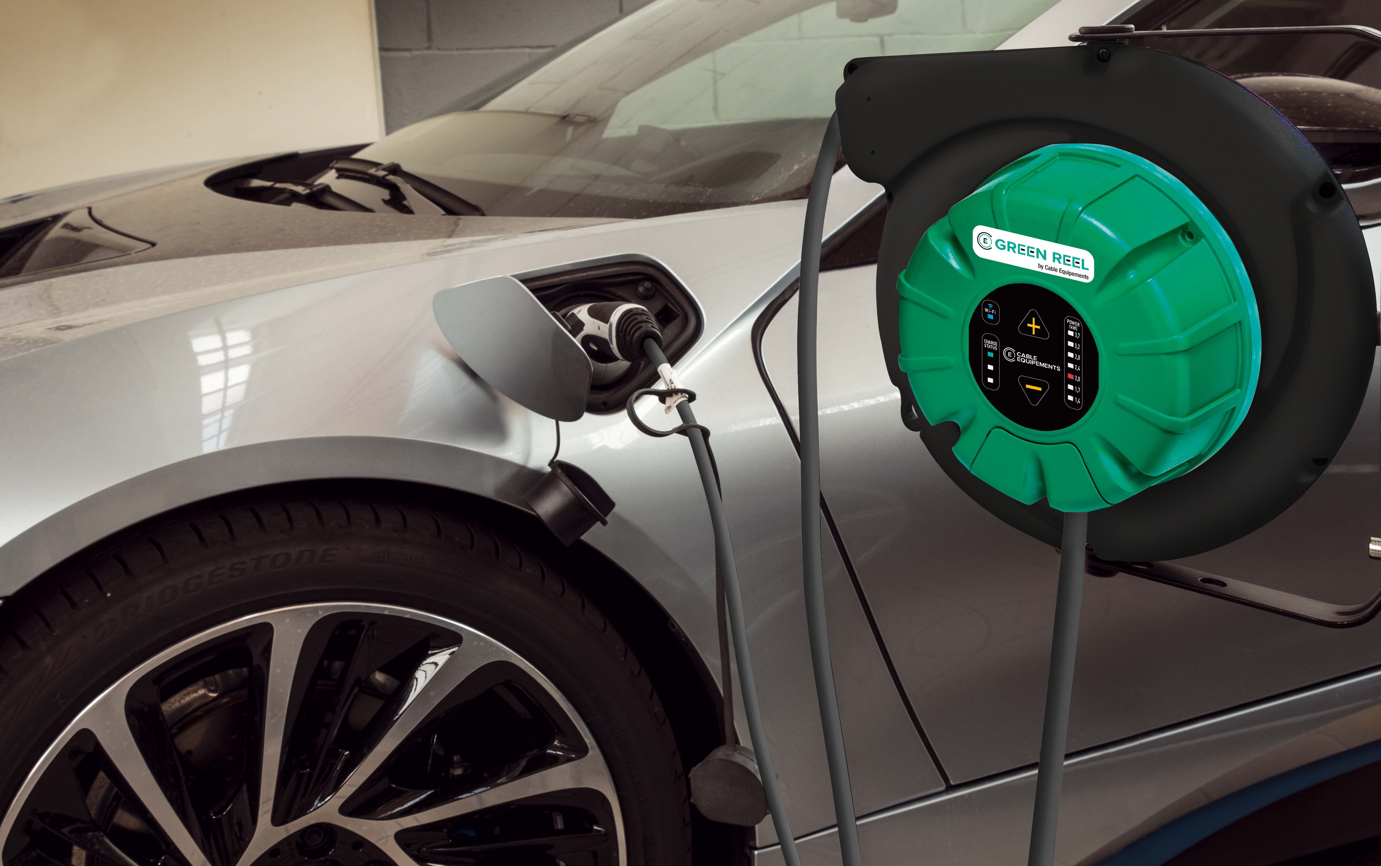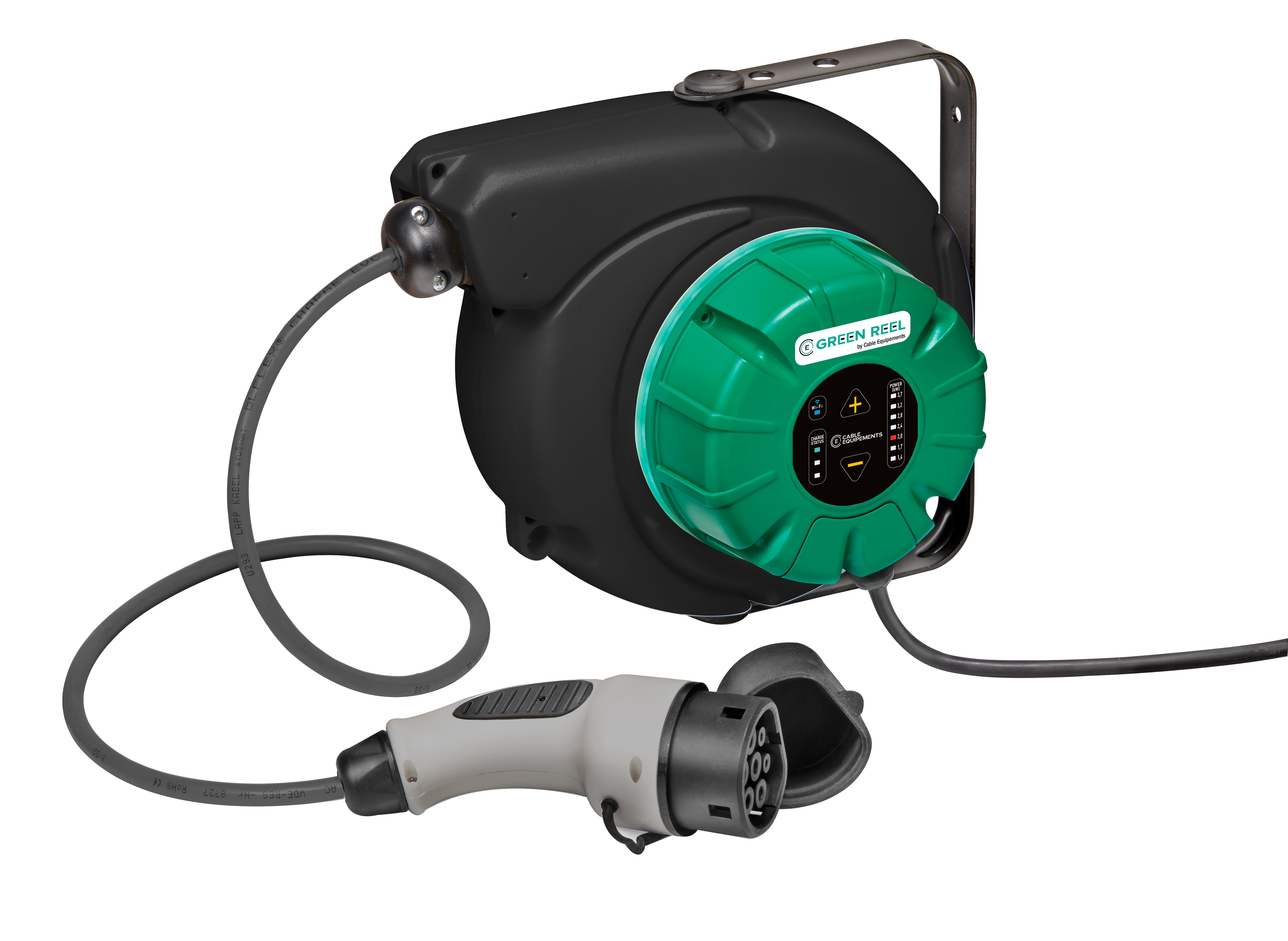 GREEN REEL 3.7 enrouleur avec borne de recharge 3,7 kW intégrée 4 m IP42 - Prisetype 2 en sortie Monophasé 16A Raccordement par professionnel agréé avec prisestype E femelle dédiée recharge et male (non fournies) selon norme NF C 61-314 -