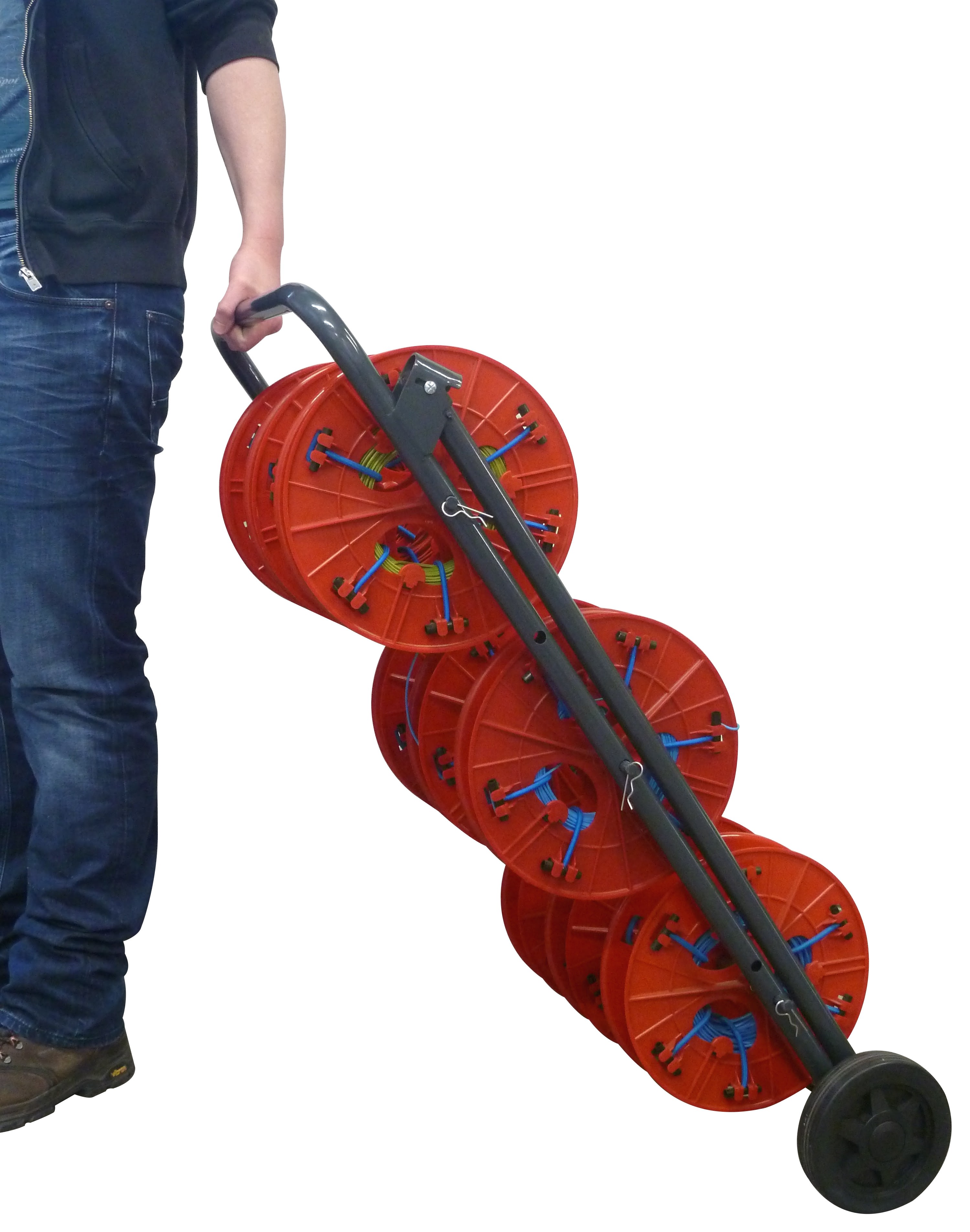 NOVOQUAD : chariot-dérouleur pour couronnes de fils, livré avec 9 bobinesà sandows diamètre 300mm, largeur maxi 100mm - 3 axes longueur utile 490mm,Ø12mm - Charge maxi 60kg - Chariot repliable, 2 roues Ø 180mm - Poids 14 kg -