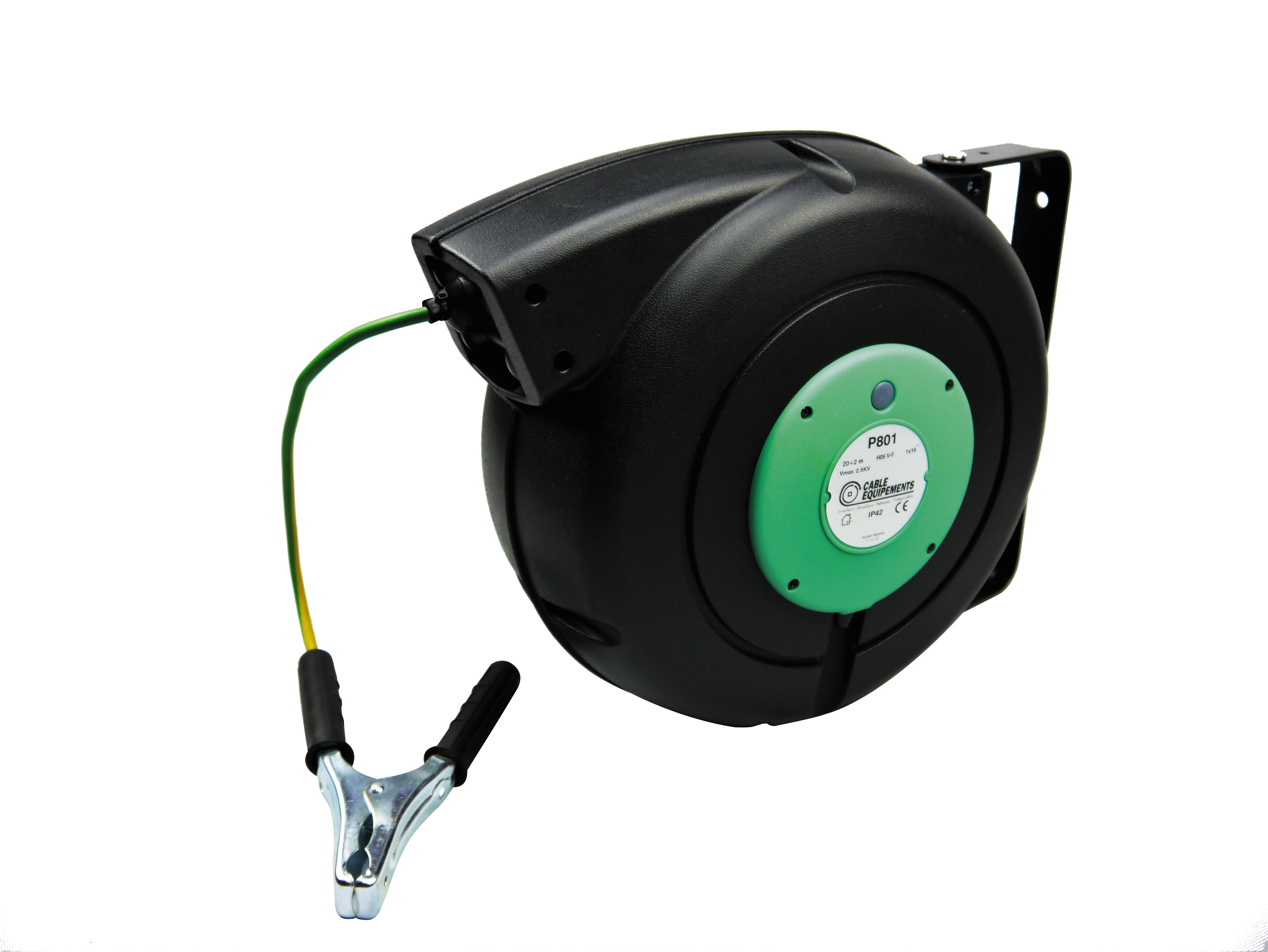 P801 : enrouleur à rappel automatique gamme PLT 800 - 20+2 m 1x16² HO5VV-F -IP42 -Cliquet à insérer - Bride pivotante - Avec pince de mise à la terre 150A -Fermé plastique noir/vert - Si vertical : option obligatoire gratuite sur dde -
