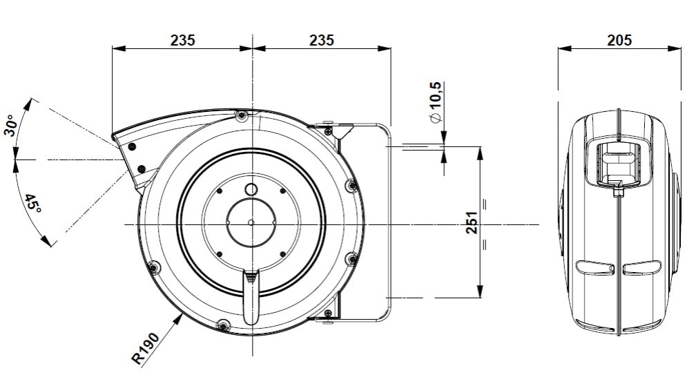 P811 : enrouleur à rappel automatique gamme PLT 800 - 13+2m 4G2,5² HO7RN-F -IP42 - Cliquet à insérer - Enroulé 2 kW déroulé 3 kW -Bride pivotante -fermé plastique noir/vert - Si vertical : option obligatoire gratuite sur dde -