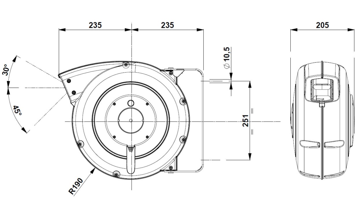 P815 : enrouleur à rappel automatique gamme PLT 800 - 10+2m 5G2,5² HO7RN-F -IP42 - Cliquet à insérer - Enroulé 2 kW déroulé 3 kW -Bride pivotante -fermé plastique noir/vert - Si vertical : option obligatoire gratuite sur dde -