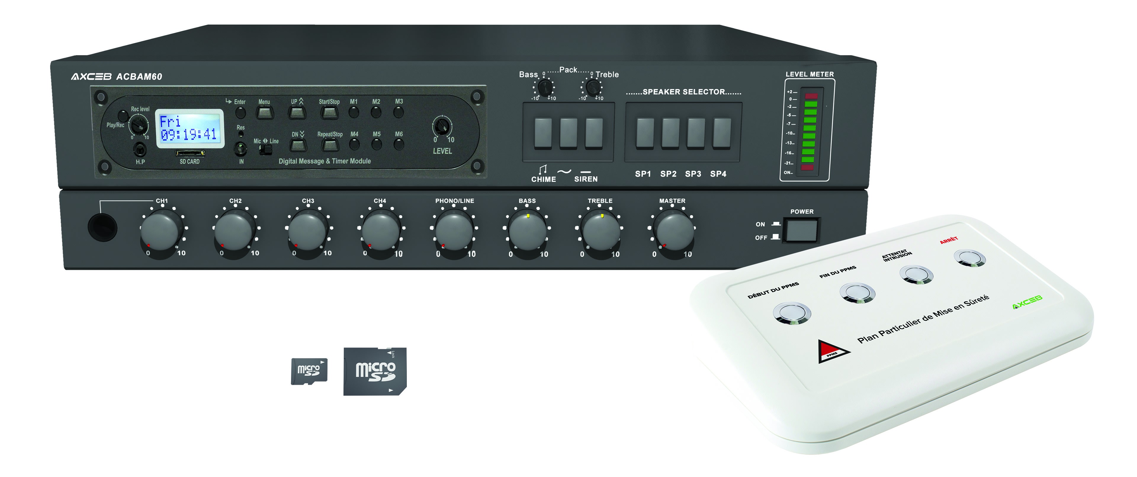 PPMS60W est une solution packagée prête à l'emploi comprenant un amplificateur 4 zones de puissance 60 W / 100 V, un lecteur de message numérique intégré à l'amplificateur, un boîtier mural 4 boutons sérigraphié permettant le déclenchement manuel des alertes PPMS et une carte SD comprenant les 4 messages d'alertes. L'amplificateur est rackable au format 19’’ – 3 U avec les équerres ACBRACK60 optionnelles.