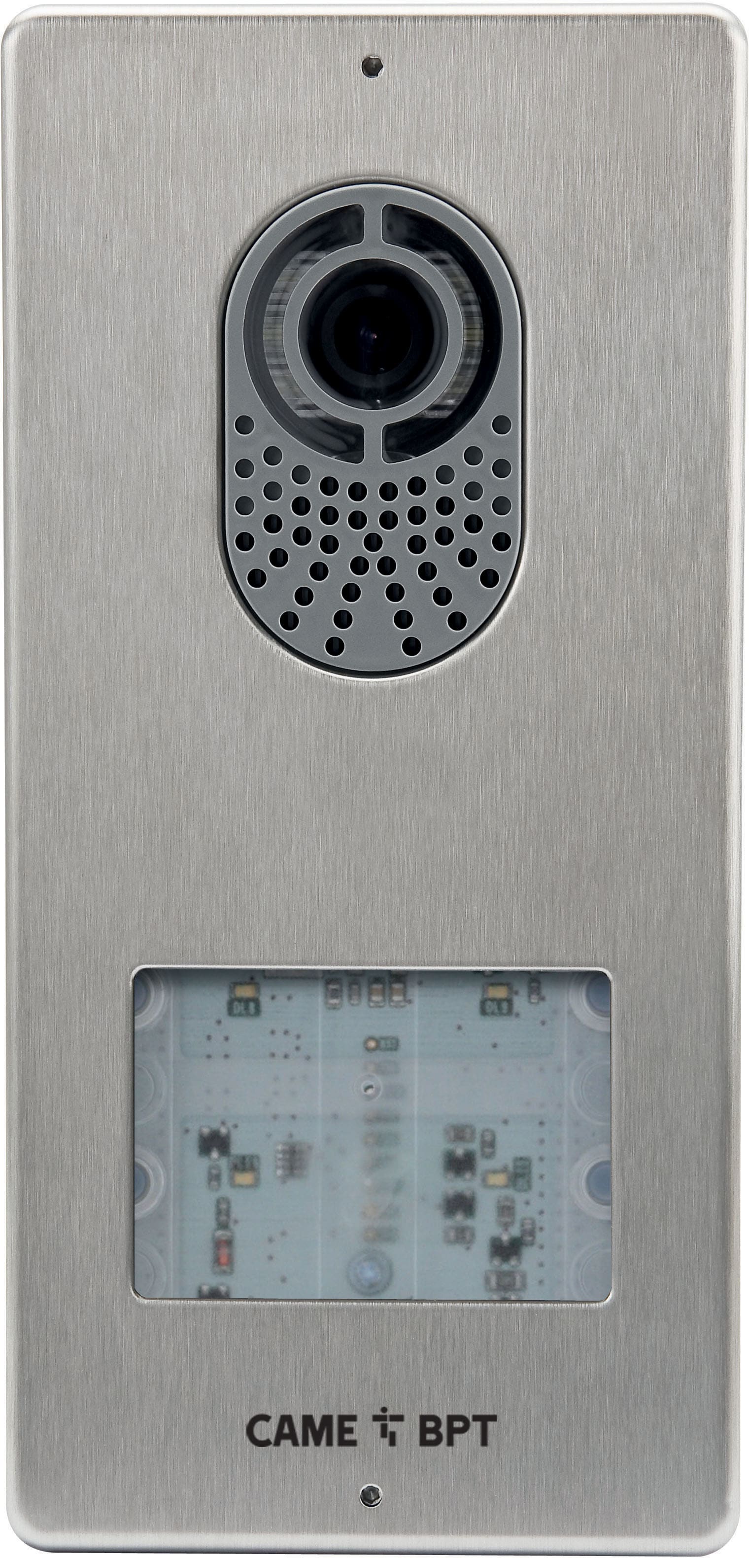 Platine de rue vidéo externe monobloc pour système X1 extensible jusqu'à 4 appels. Finition en acier inox brossé AISI 316L. Capteur caméra NTSC/PAL avec résolution 680x512 et microprocesseur intégré pour le traitement numérique du signal. Optique "wide eye", ouverture 94° à l'horizontale et 77° à la verticale.
