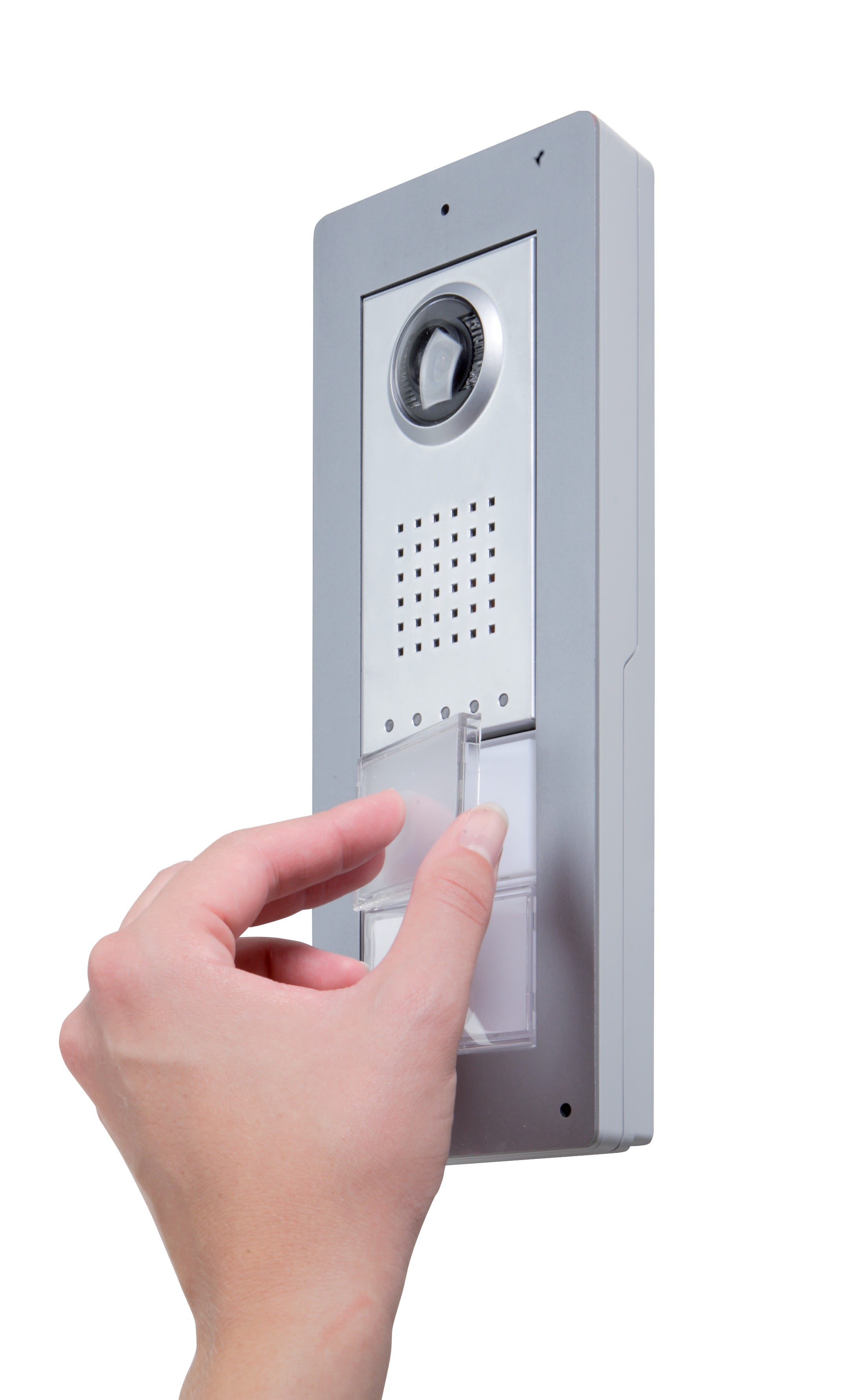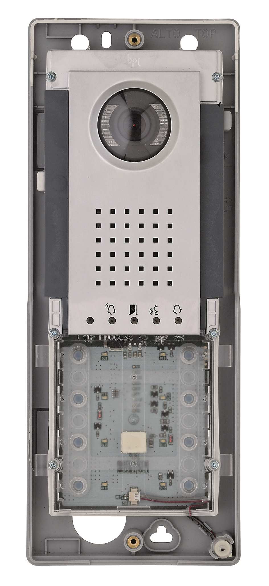 Platine de rue vidéo monobloc semi-modulaire pour système X1. Corps en polymère technique avec finition en chrome satiné Métal. Capteur caméra PAL/NTSC avec résolution 680x512 et microprocesseur intégré pour le traitement numérique du signal. Optique grand angle, ouverture 100° à l'horizontale et 82° à la verticale avec réglage numérique du zoom.