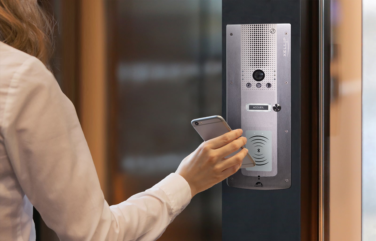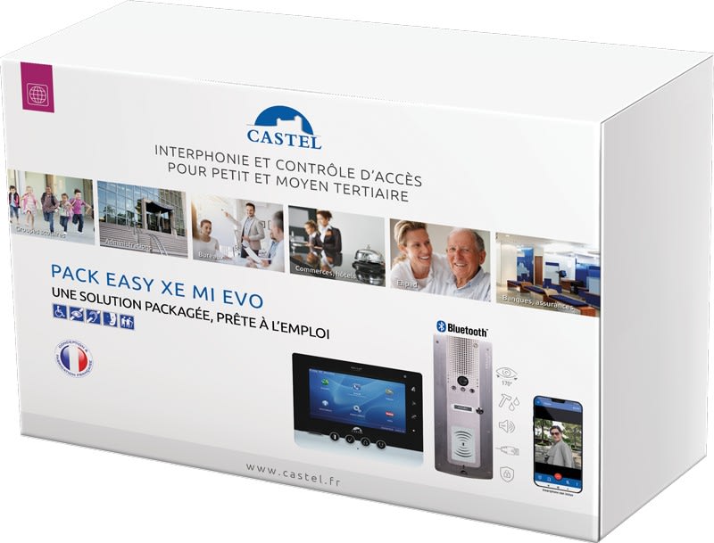 Une solution Plug & Play :- Le portier est pré-paramétré en usine pour pouvoir appeler le moniteur de réception.- Les 2 postes sont directement alimentés (PoE) par le switch.Une solution intégrant le contrôle d’accès Bluetooth :- Le badge d’accès est transféré sur le Smartphone (badge virtuel)- Une solution à la fois sécurisée et beaucoup plus instinctive- 3 modes d’identification sont disponibles selon vos besoins (mode badge, mode télécommande, mode mains-libres)Une solution conforme à la « loi accessibilité aux personnes handicapées » :- Le portier dispose d’une caméra vidéo couleur grand angle permettant au personnel de l’établissement de visualiser le visiteur (en l’absence d’une vision directe).- 3 pictogrammes PHMR visualisables avec leds de couleur indiquent l’état de fonctionnement (appel en cours, communication, porte ouverte).- Des messages sonores de tranquillisation accompagnant ces 3 phases.- Une boucle à induction auditive est directement intégrée au portier.Possibilité de recevoir les appels de votre portier directement sur votre Smartphone ou tablette :- CASTEL SIP est une solution de vidéophonie pour Smartphone et tablette qui vous permet de recevoir vos appels et d’ouvrir la porte où que vous soyez (via Wi-Fi ou 3G/4G).- La solution offre ainsi une sécurité et une qualité de service optimales et vous permet de rester connecté à votre interphone.- Simple d’utilisation et intuitive, l’application est compatible iPhone®, iPad®, ainsi que Smartphones et tablettes fonctionnant sous Android®.