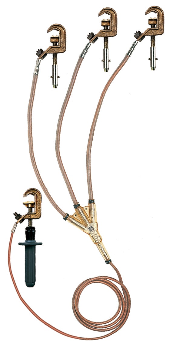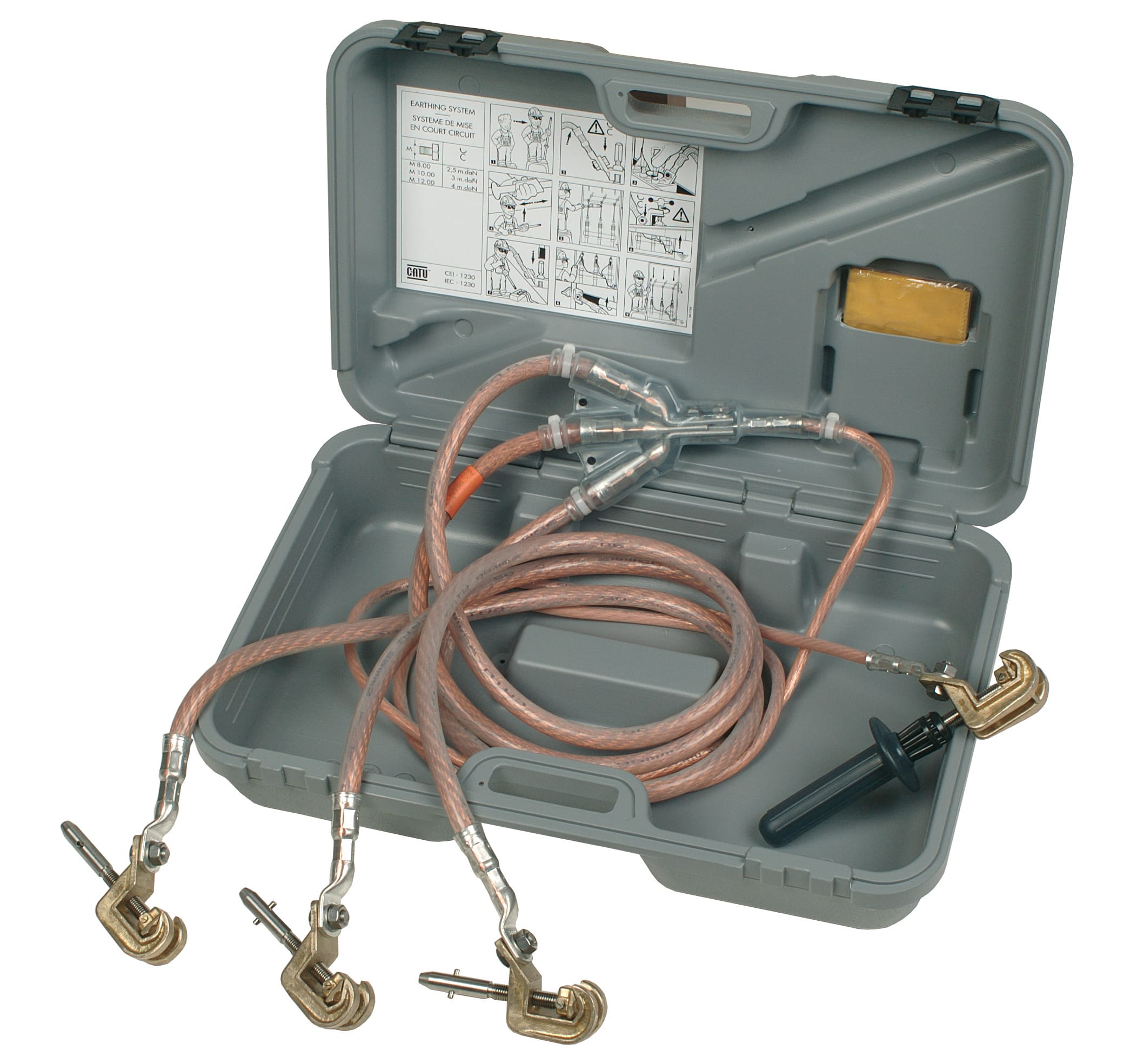 Equipement MALT/CC Icc 40 kA/1s. Conforme IEC 61230. 3 pinces pour points fixes Ø 25 et 30 mm. 1 pince pour point fixe sur poignée pour la MALT. Câbles cuivre isolés PVC: 3x150 mm² lg.1,5 m et 1x50 mm² lg.2,5 m.