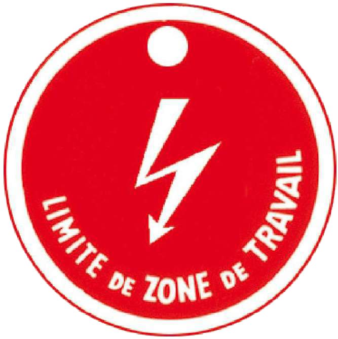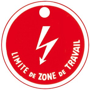 Macaron de consignation. Matière plastique, fond rouge. Fixation par suspension trou Ø 10 mm. Marquage texte : "LIMITE DE ZONE DE TRAVAIL". Pictogramme "DANGER ELECTRIQUE".