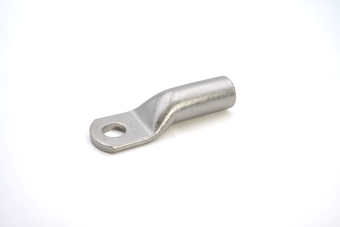 COSSES D’APPLICATIONS SPECIALES 2A-Mpour câble en cuivreLes cosses de la série 2A-M sont conçues pour un usage intensif, pour la mise à la terre des structures et des équipements intérieurs et extérieurs et pour les applications moyenne tension jusqu'à 35 kV. Les cosses de la série 2A-M sont réalisées à partir d’un tube en cuivre électrolytique d’une pureté supérieure à99,9 %. Un recuit garantit une ductilité optimale, état nécessaire pour que le métal accepte la déformation sévère subie au moment du sertissage et augmente considérablement le nombre de points de contact de la plage, au serrage. Ce recuit joue également un rôle important en présence de vibrations, évitant au maximum les fissures internes du métal ou les cassures. L’étamage électrolytique garantit une excellente résistance à la corrosion. La longueur du fût permet d’effectuer deux poinçonnages. L’absence de trou de visite permet d’éviter toute infiltration d’humidité ou autres agents atmosphériques nocifs. L’insertion du câble est facilitée par un accès du fût chanfreiné.Certificats UNI EN 13600:2003 Caractéristiques techniques Matériel (Corps): Cu-OF CW008A