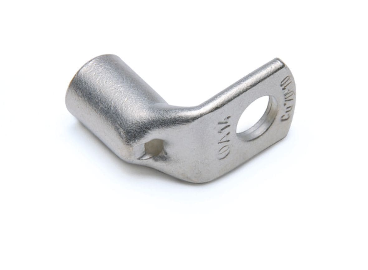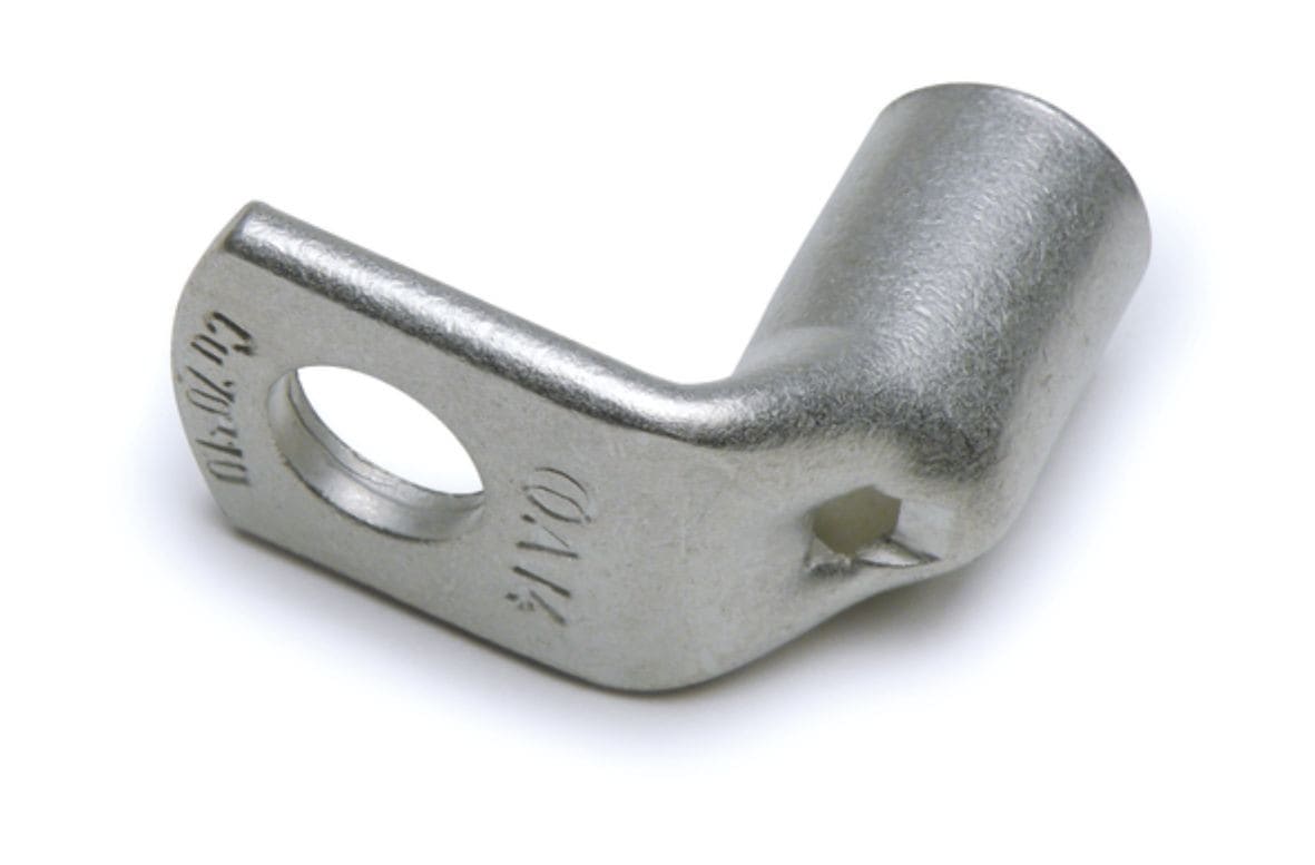 COSSES COUDÉES À 90° A-LPour câbles en cuivreLes cosses coudées à 90° de la série A-L sont réalisées à partir d’un tube en cuivre électrolytique dont la section garantit la qualité de la connexion électrique et une très bonne résistance à la traction. Elles sont recuites et protégées en surface par un étamage électrolytique. Le recuit améliore les caractéristiques structurelles de la matière, facilite le sertissage, et permet d’utiliser la cosse dans des applications à contraintes mécaniques diverses. Le fût chanfreiné facilite l’insertion du câble, et un trou d’inspection permet de contrôler sa bonne insertion. Sa longueur est parfaitement adaptée au positionnement des matrices des outils de sertissage. Sur chaque cosse figure :- Le logo et la référence Cembre- La nature et la section du conducteur en mm²- Ø de la visCes cosses peuvent être fournies à la demande avec deux trous et plus.Certificats 2011/65/EU Caractéristiques techniques Matériel (Corps) : Cuivre ETP étamé électrolytiquementMatériel (Fût) : Cuivre ETP étamé électrolytiquementAttaque flexion : 90°