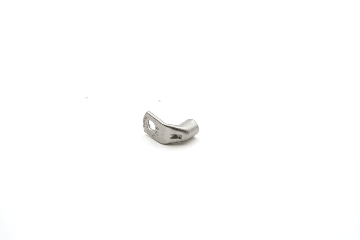 COSSES COUDÉES À 90° A-LPour câbles en cuivreLes cosses coudées à 90° de la série A-L sont réalisées à partir d’un tube en cuivre électrolytique dont la section garantit la qualité de la connexion électrique et une très bonne résistance à la traction. Elles sont recuites et protégées en surface par un étamage électrolytique. Le recuit améliore les caractéristiques structurelles de la matière, facilite le sertissage, et permet d’utiliser la cosse dans des applications à contraintes mécaniques diverses. Le fût chanfreiné facilite l’insertion du câble, et un trou d’inspection permet de contrôler sa bonne insertion. Sa longueur est parfaitement adaptée au positionnement des matrices des outils de sertissage. Sur chaque cosse figure :- Le logo et la référence Cembre- La nature et la section du conducteur en mm²- Ø de la visCes cosses peuvent être fournies à la demande avec deux trous et plus.Certificats 2011/65/EU Caractéristiques techniques Matériel (Corps) : Cuivre ETP étamé électrolytiquementMatériel (Fût) : Cuivre ETP étamé électrolytiquementAttaque flexion : 90°