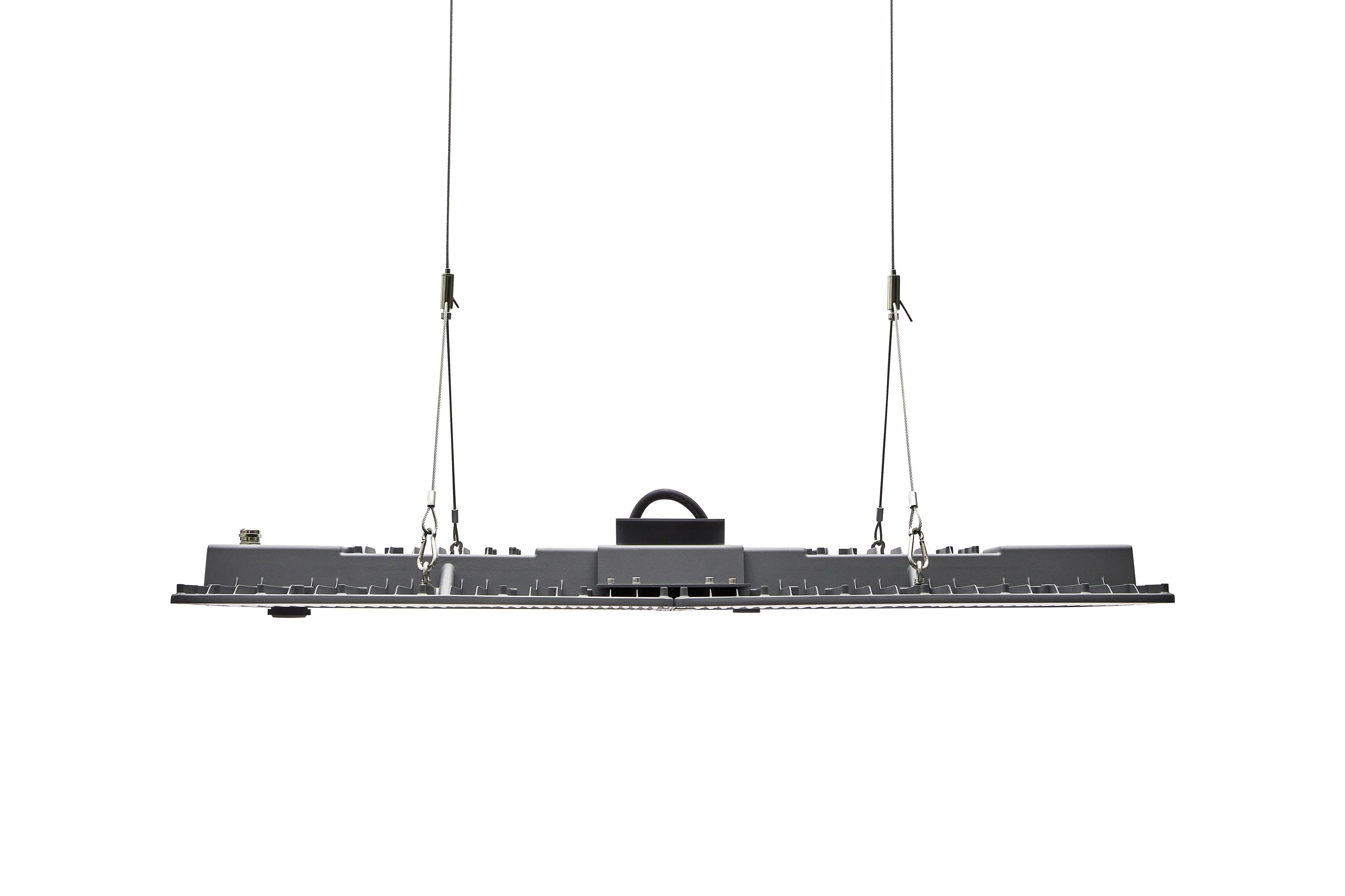 Luminaire grande hauteur pour la logistique et l'industrie. Armature avec angle symétrique Large 75° pour une distribution homogène de l'éclairage. Livré avec un câble d'alimentation de 2m et câbles de suspension de 1m. Corps aluminium et diffuseur polycarbonate. IP65, IK08, Classe I, 4000K, IRC80, SDCM 3. Capteur compatible Zhaga Book 18. Flux lumineux 54000lm, Puissance 290W, Efficacité lumineuse 186lm/W. Durée de vie 105 000h (L80B50). Dimensions (LxlxH) 446 x 963 x 106mm. Poids 10,66 kg. Finition Gris basalte RAL7012. Température de fonctionnement -30…+50°C. Armature robuste certifiée ENEC. IFS pour les sites agroalimentaires, Marquage "D" pour les sites exposés au risque incendie. Convient pour les complexes sportifs - certifié VDE impacts de balles et de ballons. Garantie de 5 ans. Adapté à un montage au plafond ou suspendu par les accessoires optionnels. Sylvania est signataire de la charte LED. Produit éligible CEE.