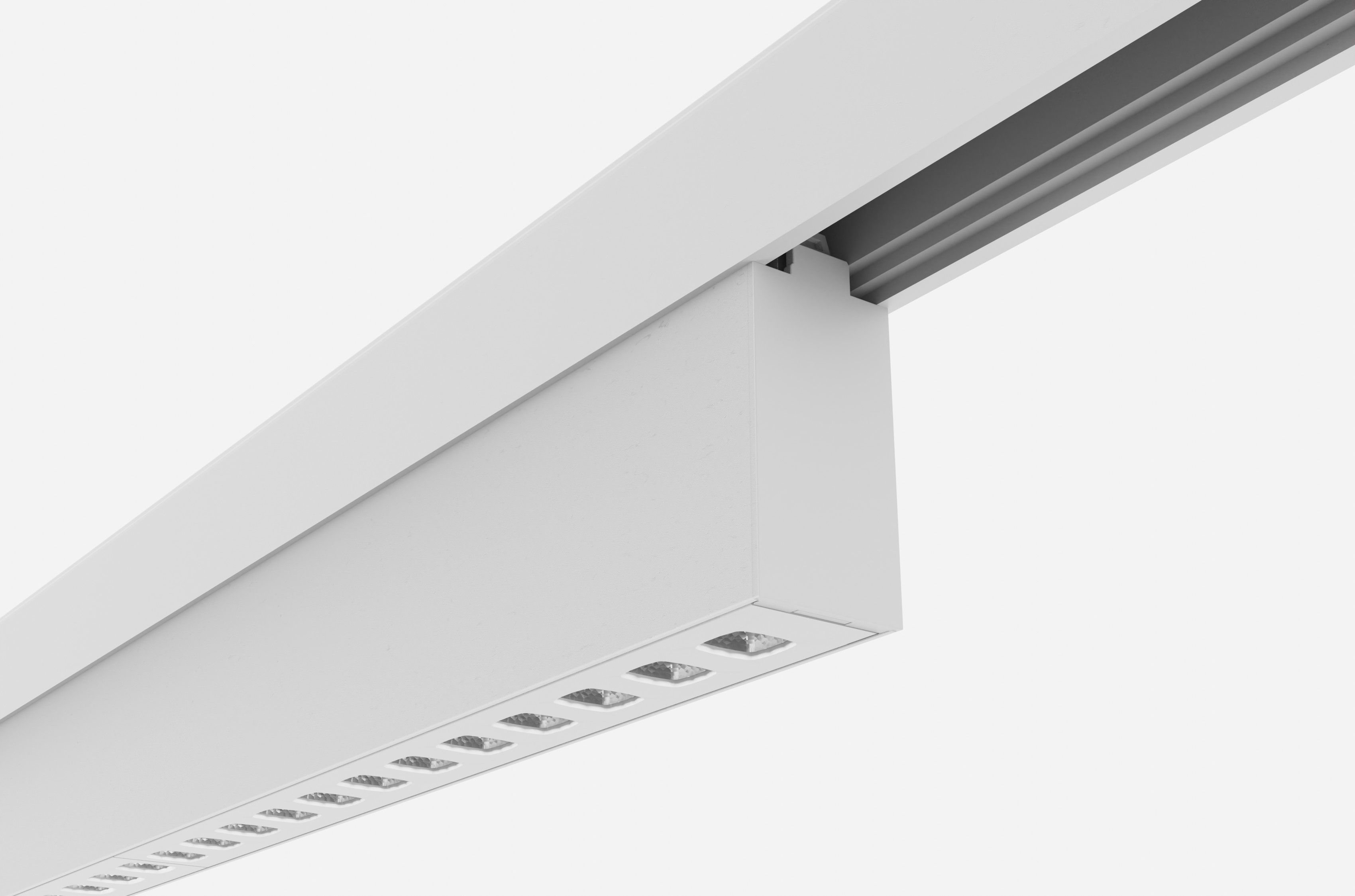 Raxa, système de rail 3 phases au design modulaire et élégant. Facile, rapide à installer. Adaptateur de rail spécifique sécurisé. Profil aluminium 32mm blanc. UGR19, Angle 68°. 3000K, 10,6 W, 825 lm, 78 lm/W, Ra90, SDCM3.