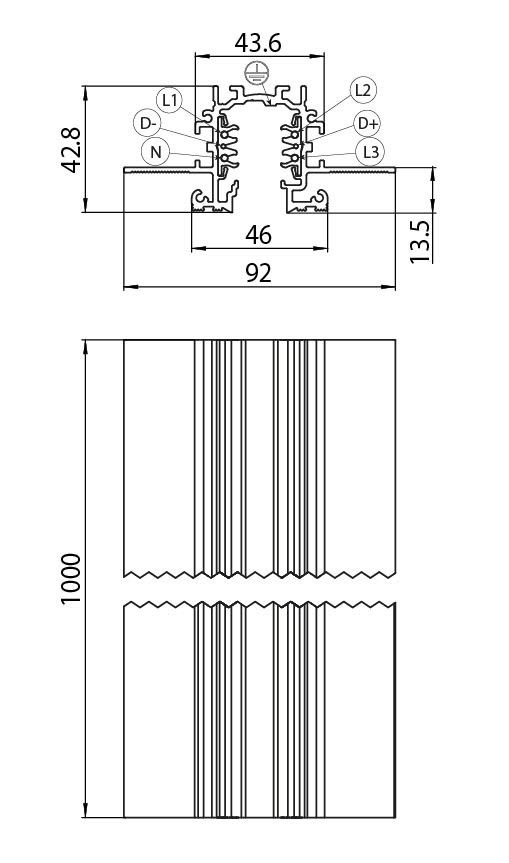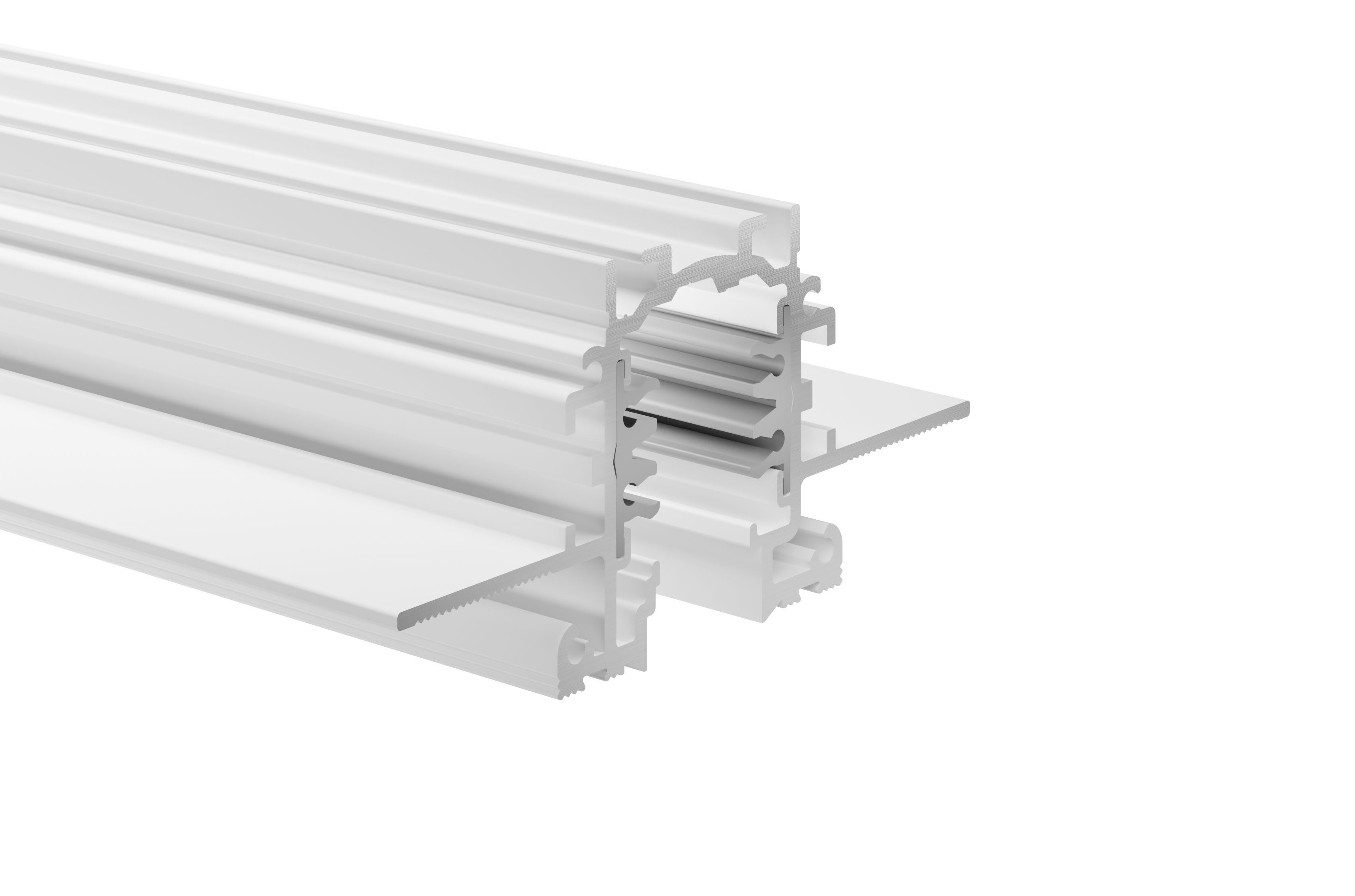 Multiples applications. Rail aluminium en 1m, 2m et 3m. Profils découpables. Système Triphasé «L1/L2/L3/Neutre/Terre 16A/440V» + 2 conducteurs de contrôle «D+/D- 2x1A/50V FELV AC » (DALI, DMX, 1-10V). Compatible avec accessoires OneTrack