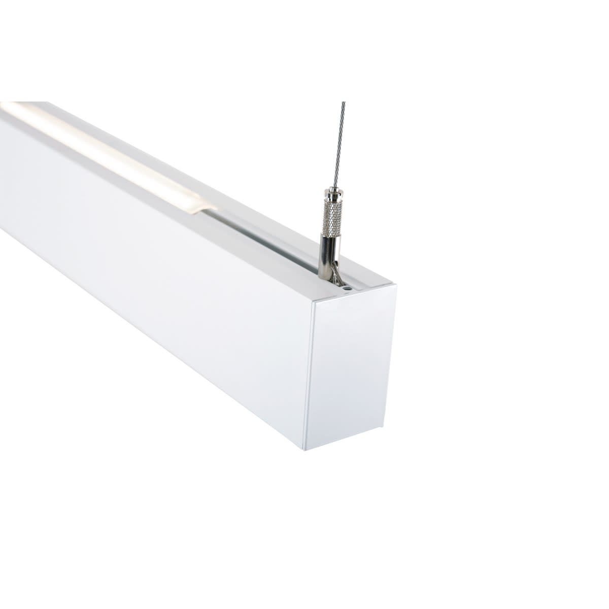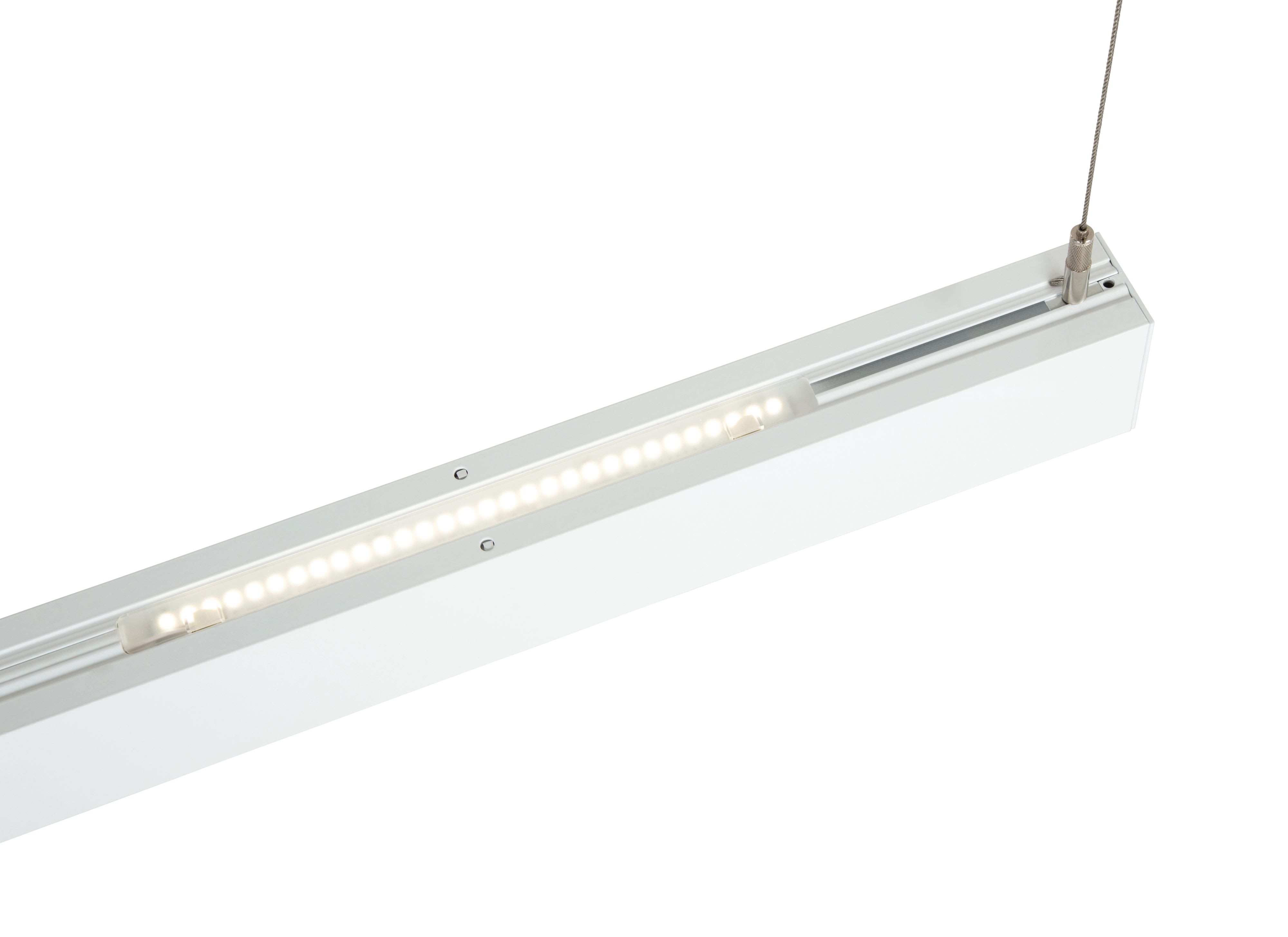 Luminaire LED linéaire, pour installation suspendue. Module pour la réalisation de lignes continues. Longueur 1200mm. Finition blanche. Diffuseur prismatique. Eclairage direct/indirect (65/35%) adressable séparément via DALI. Flux 3850lm, efficacité lumineuse 133lm/W. Température de couleur : blanc neutre (4000K). IRC > 80 / SDCM < 3. Groupe de risque photobiologique GR0. IP20 / IK03. Durée de vie 92 500 heures (L80). Garantie 5 ans.