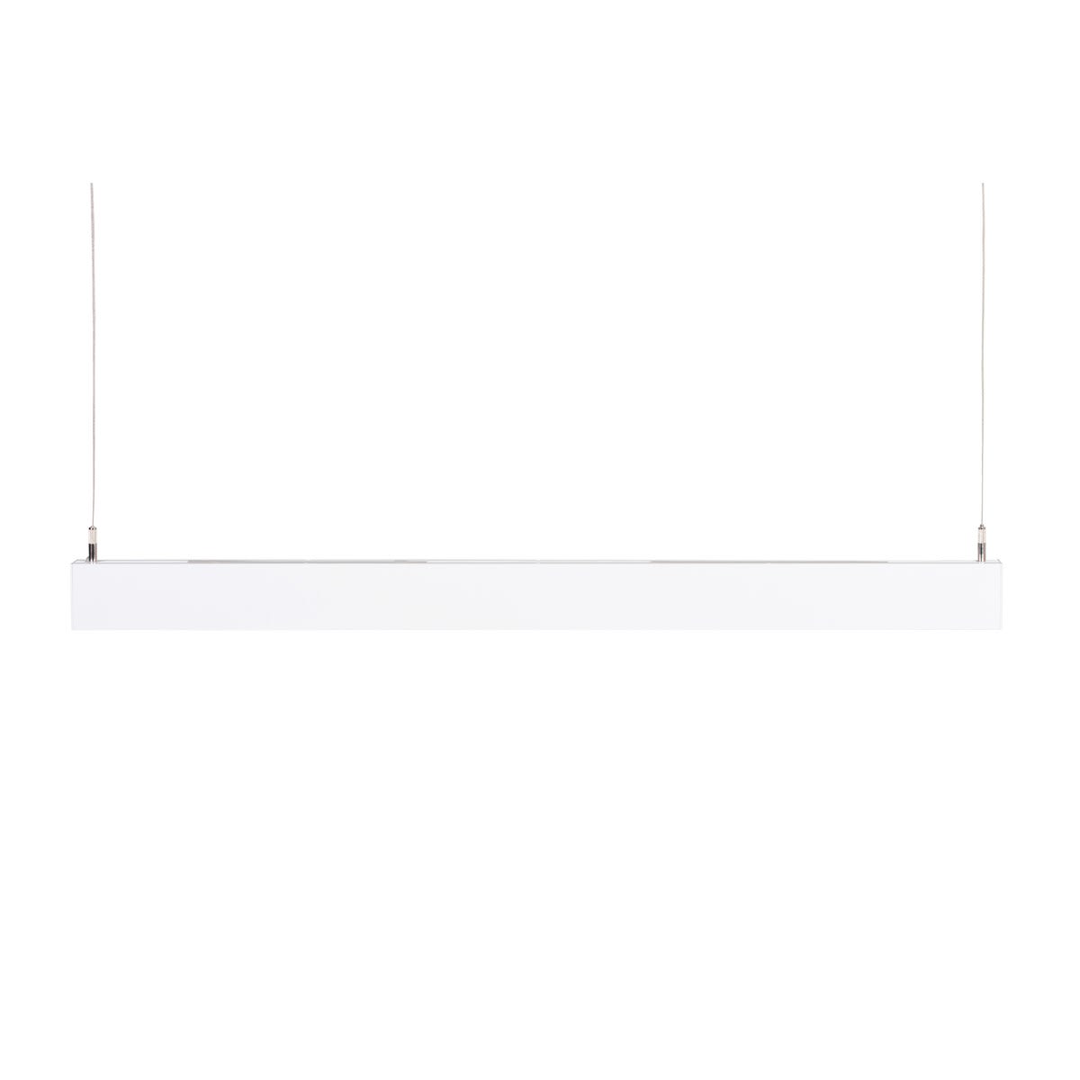 Luminaire LED linéaire, pour installation suspendue. Kit pré-câblé et pré-équipé avec embouts et câbles de suspension. Longueur 1200mm. Finition blanche. Diffuseur opale. Eclairage direct/indirect (65/35%) adressable séparément via DALI. Flux 4050lm, efficacité lumineuse 140lm/W. Température de couleur : blanc neutre (4000K). IRC > 80 / SDCM < 3. Groupe de risque photobiologique GR0. IP20 / IK03. Durée de vie 92 500 heures (L80). Garantie 5 ans.