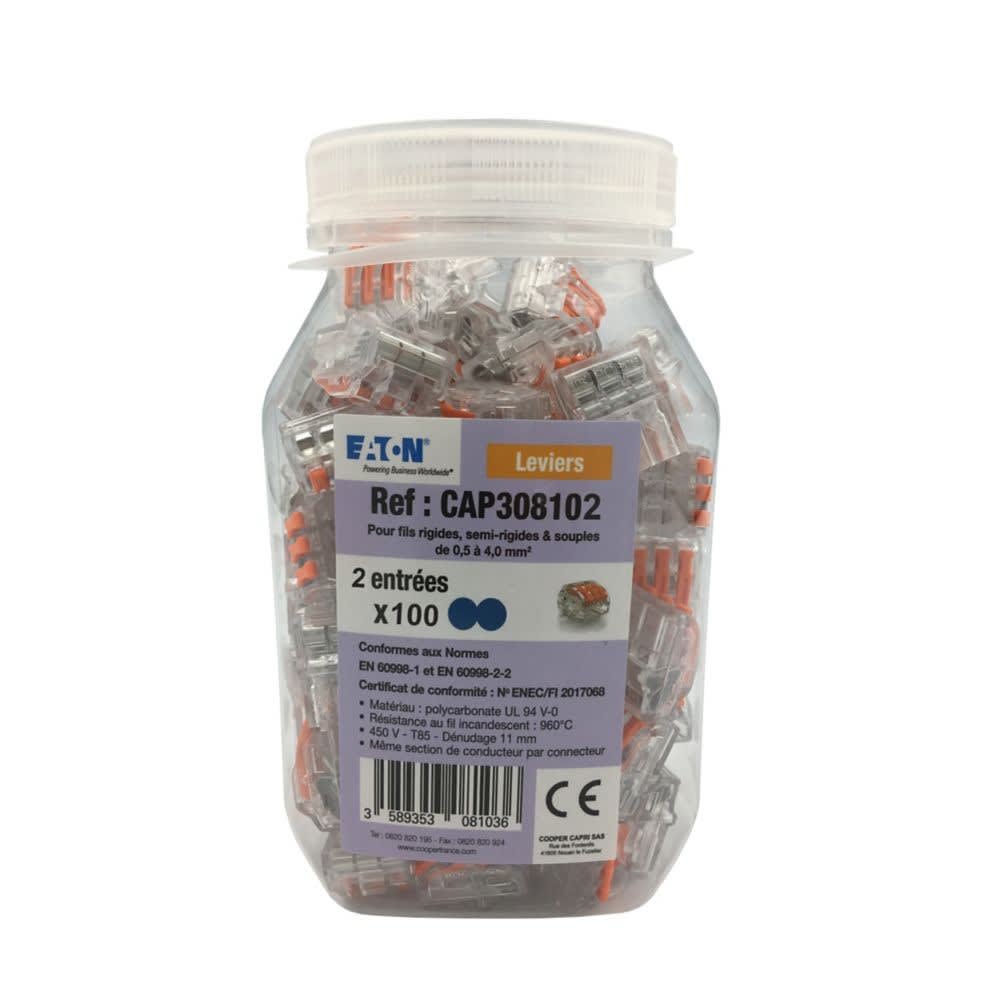 Cooper Capri - Borne à levier 2 entrées EATON pour fils souples et rigides 0,2 à 4mm2 24A-450V - CAP308102