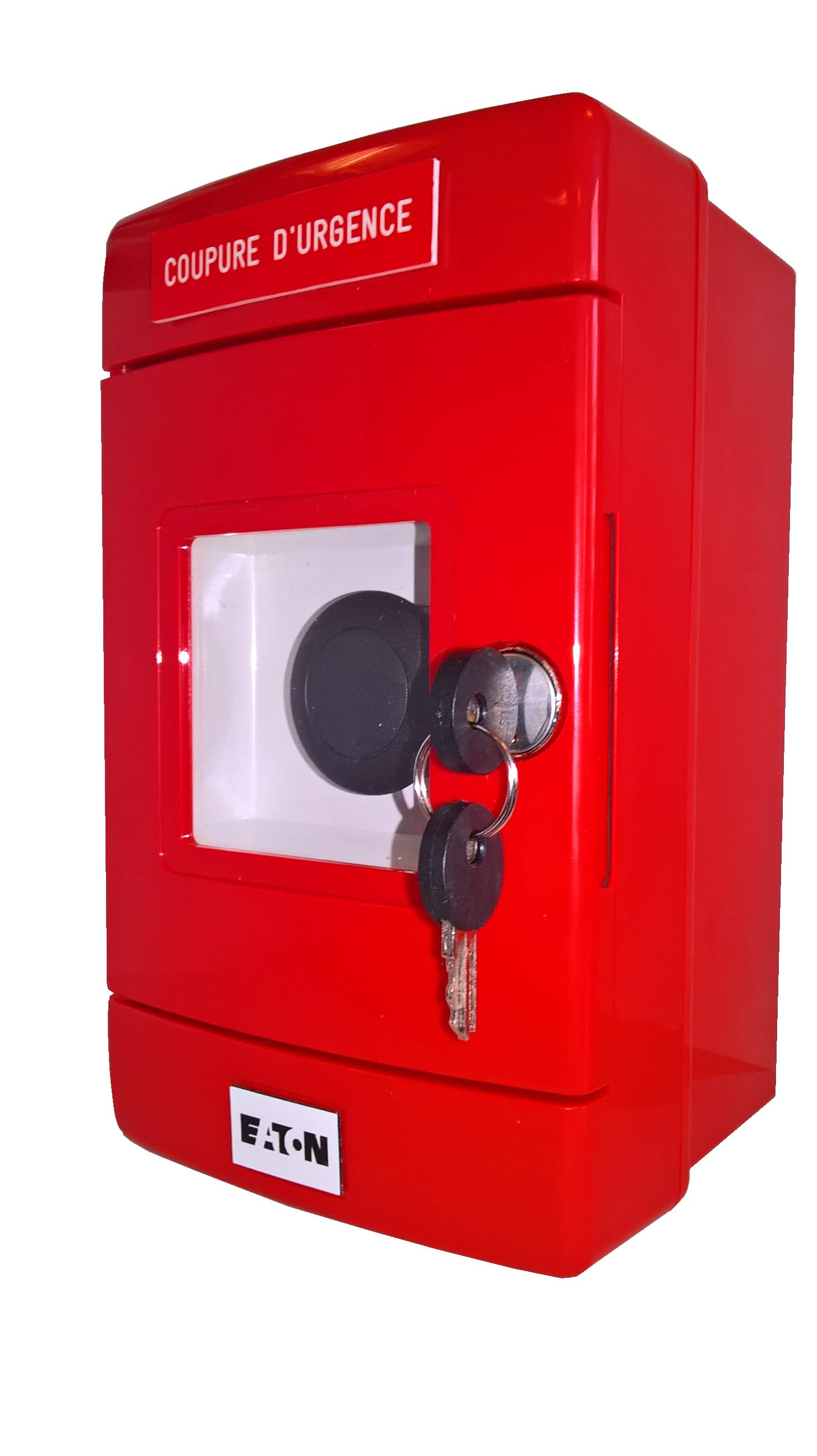 Eaton propose une gamme complète de coffrets équipés spécialement conçus pour les chaufferies. Ils permettent de gérer manuellement les coupures d'urgence ou forcer l'arrêt du désenfumage. Dans le cadre de la prévention incendie, ces coffrets étanches (IP67) de coupure d'urgence sont de couleur rouge. Ils doivent être installés à l'extérieur de la chaufferie pour assurer une coupure sans risque. La face avant en verre peut facilement être brisée à l'aide d'un marteau.