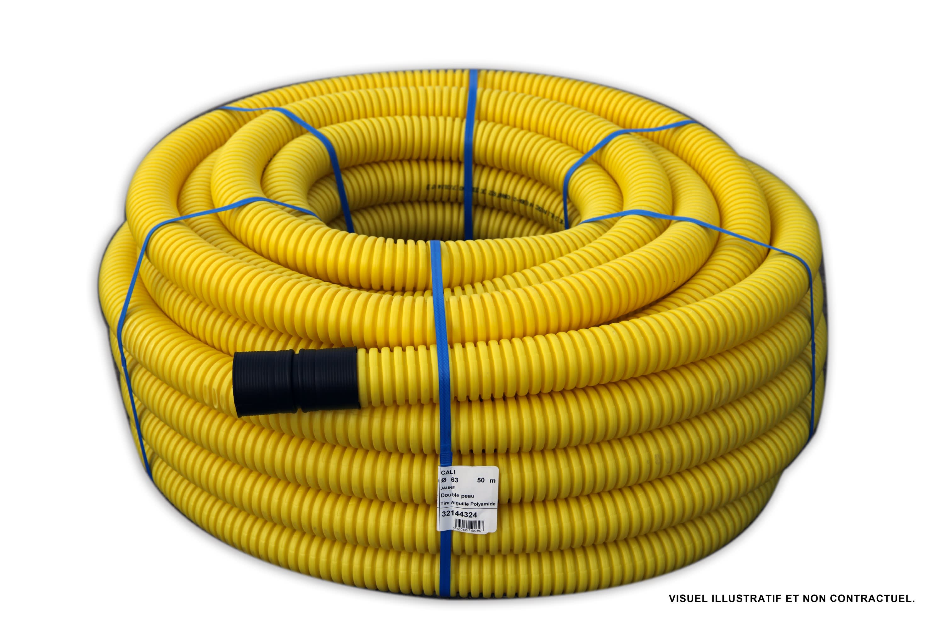 CALI jaune 63/50 - Le fourreau TPC vous permet de protéger les réseaux enterrés. Sa couleur JAUNE correspond aux réseaux de type Gaz. Dans le cadre des chantiers de travaux publics, un fourreau TPC doit être utilisé simultanément avec un grillage avertisseur réglementaire selon la norme NF 12613. Les gaines TPC offrent une bonne isolation et étanchéité, garantissant ainsi la sécurité et la durabilité des réseaux. Afin d'assurer une pose durable et optimale, un guide de pose pour fourreaux annelés a été créé par le syndicat STRPEPP. Norme NF P 98-331 Chaussées et dépendances - tranchées : ouverture, remblayage, réfection. Norme NF P 98-332 Règles de distances entre les réseaux enterrés et règles de voisinage entre les réseaux et les végétaux. Pour les traversées de profondeur non réglementaire, ils doivent être utilisés noyés dans un béton armé d’un treillis. Ces fourreaux sont disponibles en couronnes ou en barres et sont livrés avec un manchon. Conçu avec des matières plastiques 100% recyclables - Fabriqué en France