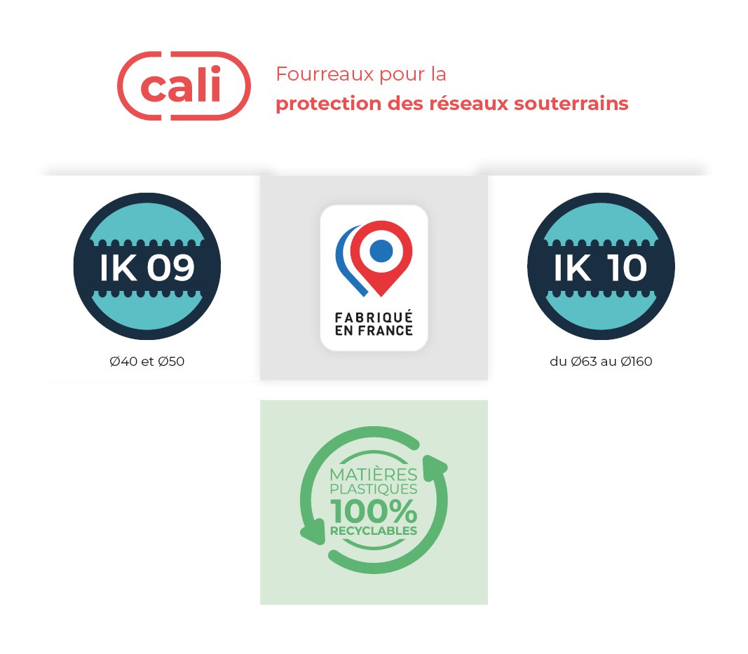 CALI vert 75/50 - Le fourreau TPC vous permet de protéger les réseaux enterrés. Sa couleur VERT correspond aux réseaux de type Télécommunications. Dans le cadre des chantiers de travaux publics, un fourreau TPC doit être utilisé simultanément avec un grillage avertisseur réglementaire selon la norme NF 12613. Les gaines TPC offrent une bonne isolation et étanchéité, garantissant ainsi la sécurité et la durabilité des réseaux. Afin d'assurer une pose durable et optimale, un guide de pose pour fourreaux annelés a été créé par le syndicat STRPEPP. Norme NF P 98-331 Chaussées et dépendances - tranchées : ouverture, remblayage, réfection. Norme NF P 98-332 Règles de distances entre les réseaux enterrés et règles de voisinage entre les réseaux et les végétaux. Pour les traversées de profondeur non réglementaire, ils doivent être utilisés noyés dans un béton armé d’un treillis. Ces fourreaux sont disponibles en couronnes ou en barres et sont livrés avec un manchon. Conçu avec des matières plastiques 100% recyclables - Fabriqué en France
