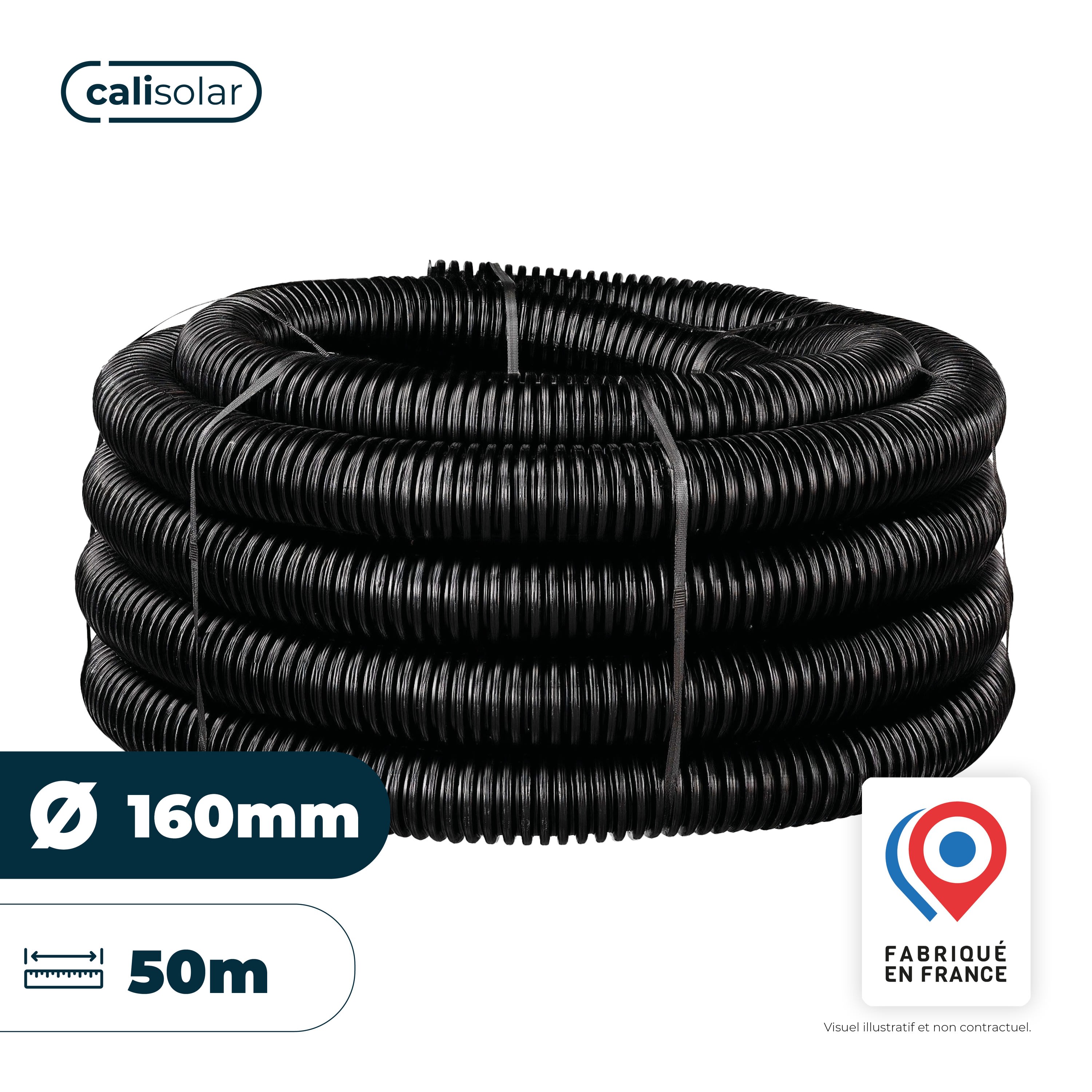 Calisolar 160/50 - Calisolar est un fourreau résistant aux UV utilisé pour la protection mécanique des installations électriques. Idéal pour la protection des installations photovoltaïques, sa composition permet différents types d'installation : en apparent à l'extérieur des bâtiments, en souterrain ou en aérosouterrain. Ce produit a une double peau ainsi qu'un fil tire aiguille en polyamide pour une mise en œuvre plus simple. Disponibles en ⌀75, ⌀90, ⌀110 et ⌀160, les fourreaux électriques Calisolar vous assurent une protection optimale de vos installations électriques dans différents environnements de pose. En dehors des applications photovoltaïques, Calisolar peut aussi correspondre à d’autres besoins en termes de protection de câbles grandes sections à l’extérieur des bâtiments. Livré avec un manchon sur chaque couronne. Conçu avec des matières plastiques 100% recyclables - Fabriqué en France