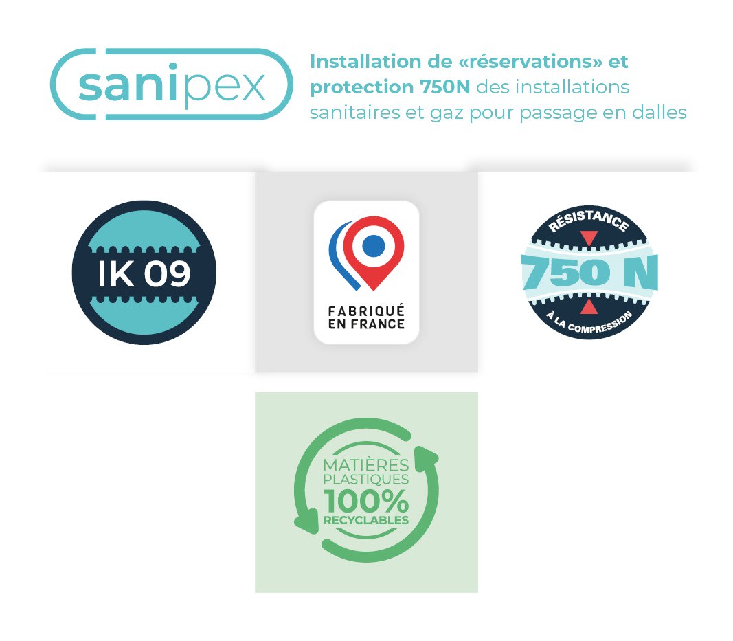 Sanipex 40/150 - Sanipex est une gaine sanitaire pour l'installation de « réservations » et la protection des canalisations sanitaires pour des tubes type PER ou multicouche, destinés à véhiculer de l’eau chaude et froide sous pression (sous planchers, dalles pleines et chapes).De couleur blanche, Sanipex est dotée d'une peau intérieur lisse et d'une glisse améliorée pour un passage facilité des tubes, un gain de temps et un confort d'usage important.Haute résistance à la compression (750N) et aux chocs 15J (IK09) pour une protection optimale des installations sanitaires. Meilleure tenue aux UV, pour les produits en attente sur les chantiers.La gaine Sanipex est disponible en Ø40 et Ø50, elle peut être associée à notre accessoire Saniboite, une boîte de réservation en dalle qui assure une sortie propre de la gaine et des tubes PER. IK09 - Conçu avec des matières plastiques 100% recyclables - Fabriqué en France