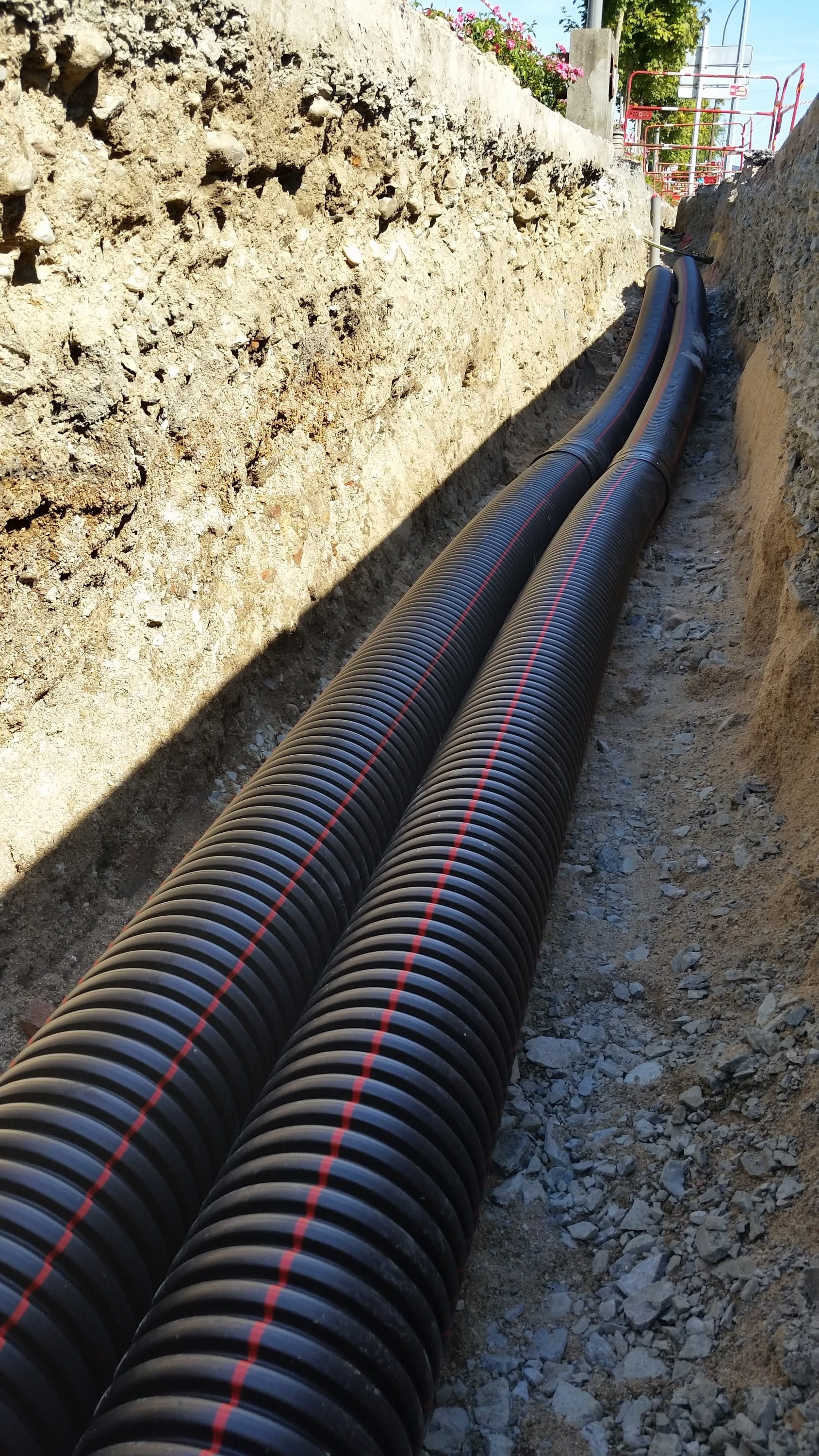 Tpgliss nbr 50/50 - Le fourreau Tpgliss vous permet de protéger les réseaux enterrés. Sa couleur noire à bandes rouges correspond aux réseaux de type Électricité. Dans le cadre des chantiers de travaux publics, un fourreau Tpgliss doit être utilisé simultanément avec un grillage avertisseur réglementaire selon la norme NF 12613. Ce fourreau est spécifique pour les installations Enedis car il garantit 100 mètre des tirage conformément au CCTP. Sa double peau et son fil tire-aiguille en polyamide facilitent la mise en œuvre. De plus, sa couleur noire prédominante améliore la tenue aux UV pour un stockage courte durée. Les gaines Tpgliss offrent une bonne isolation et étanchéité, garantissant ainsi la sécurité et la durabilité des réseaux. Afin d'assurer une pose durable et optimale, un guide de pose pour fourreaux annelés a été créé par le syndicat STRPEPP. Norme NF P 98-331 Chaussées et dépendances - tranchées : ouverture, remblayage, réfection. Norme NF P 98-332 Règles de distances entre les réseaux enterrés et règles de voisinage entre les réseaux et les végétaux. Pour les traversées de profondeur non réglementaire, ils doivent être utilisés noyés dans un béton armé d’un treillis. Ces fourreaux sont disponibles en couronnes ou en barres et sont livrés avec un manchon. Conçu avec des matières plastiques 100% recyclables - Fabriqué en France