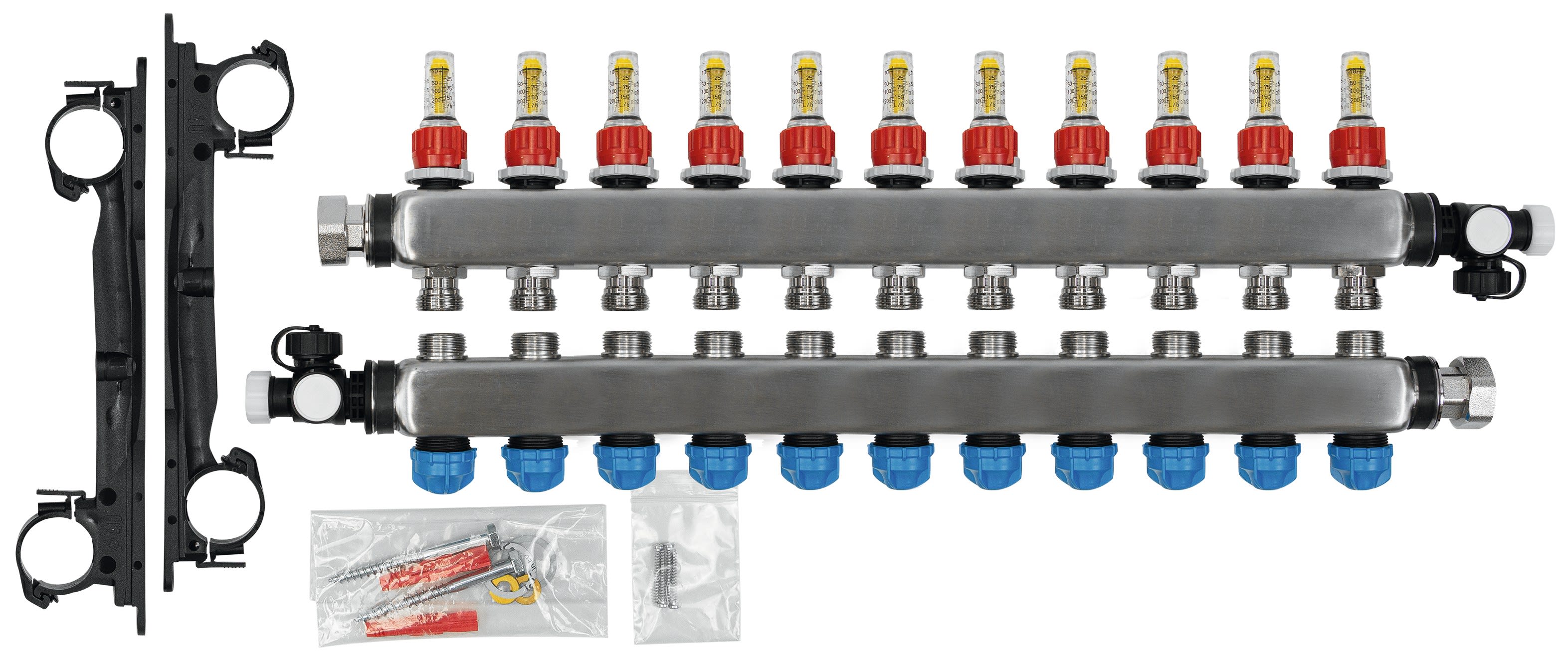 Collecteur gamme RMV pour tous les systèmes de plancher chauffant et systèmes de raccordement aux radiateurs. Collecteur en acier adapté à des hauteurs même les plus réduites. Raccordement de tubes jusqu'à 20 mm de diamètre