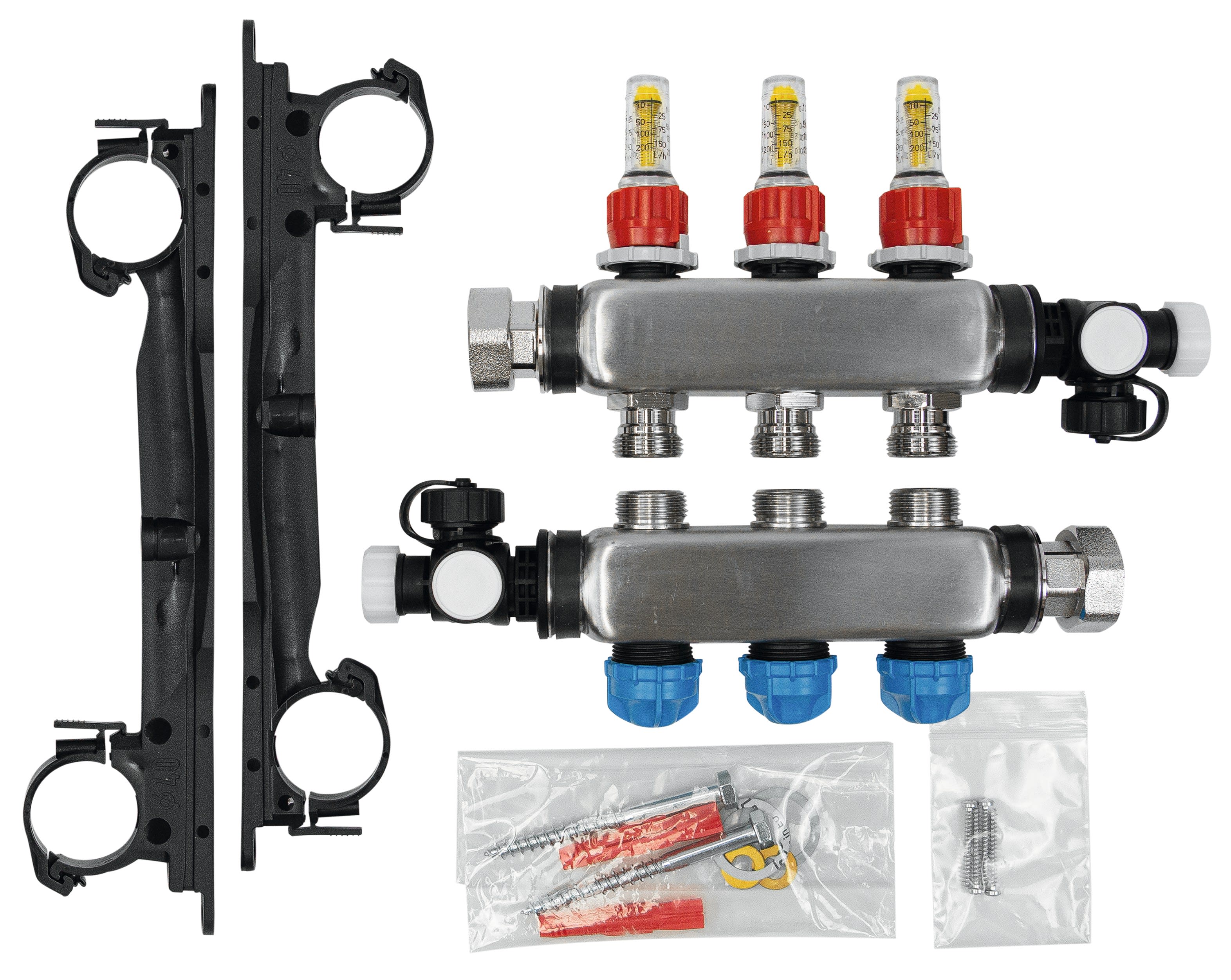 Collecteur gamme RMV pour tous les systèmes de plancher chauffant et systèmes de raccordement aux radiateurs. Collecteur en acier adapté à des hauteurs même les plus réduites. Raccordement de tubes jusqu'à 20 mm de diamètre