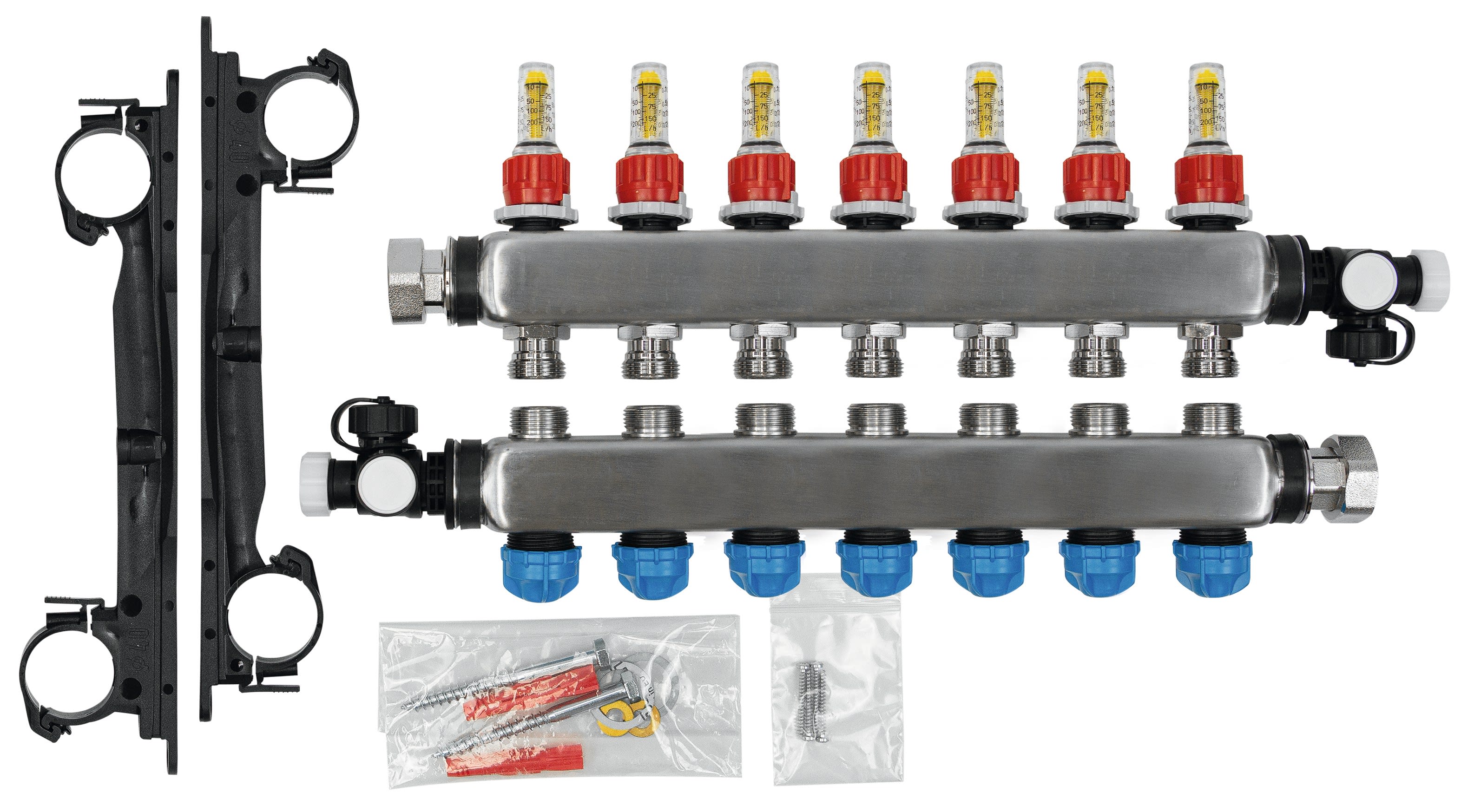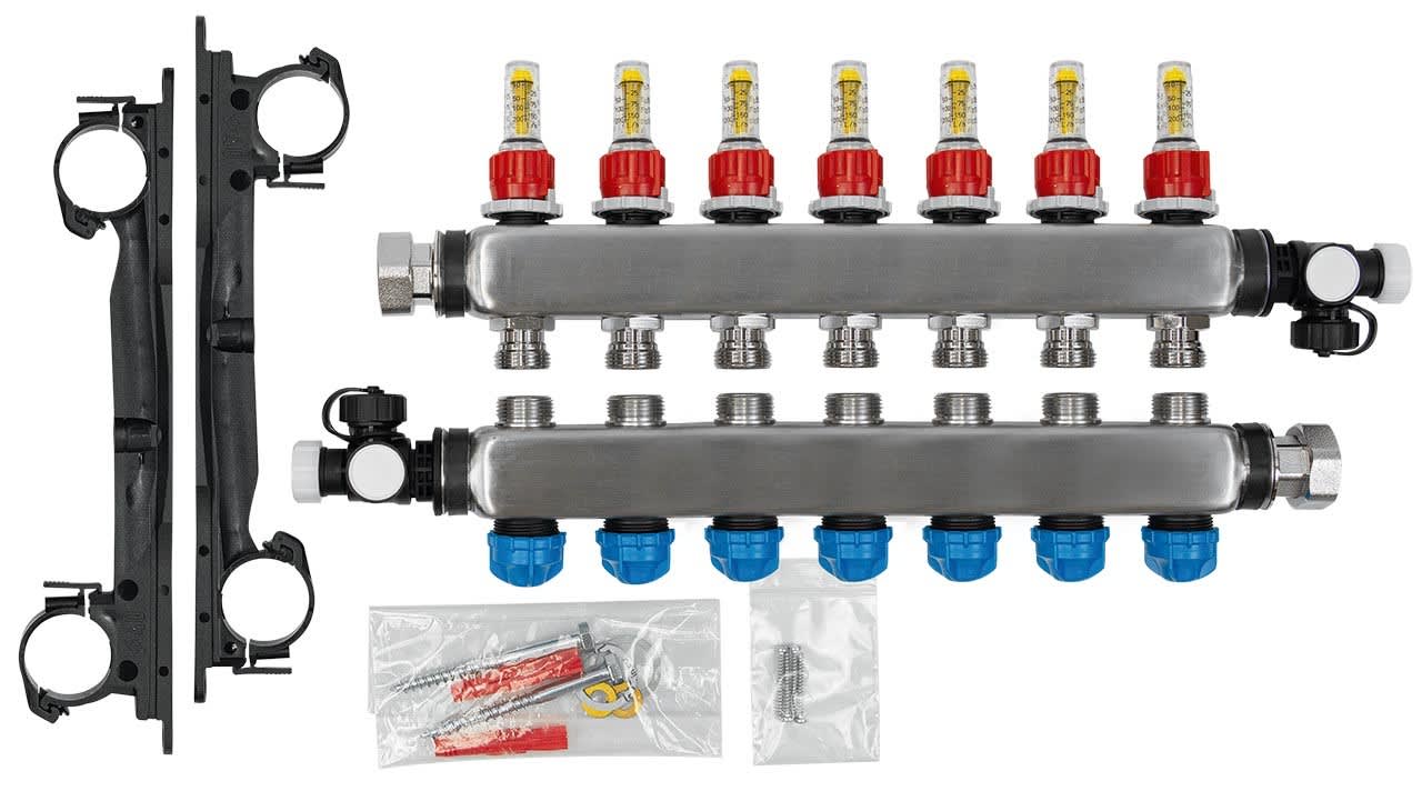 Collecteur gamme RMV pour tous les systèmes de plancher chauffant et systèmes de raccordement aux radiateurs. Collecteur en acier adapté à des hauteurs même les plus réduites. Raccordement de tubes jusqu'à 20 mm de diamètre