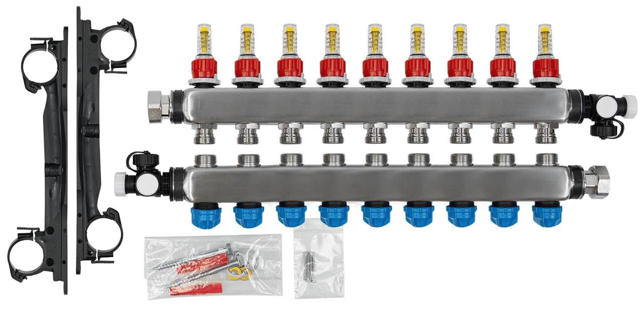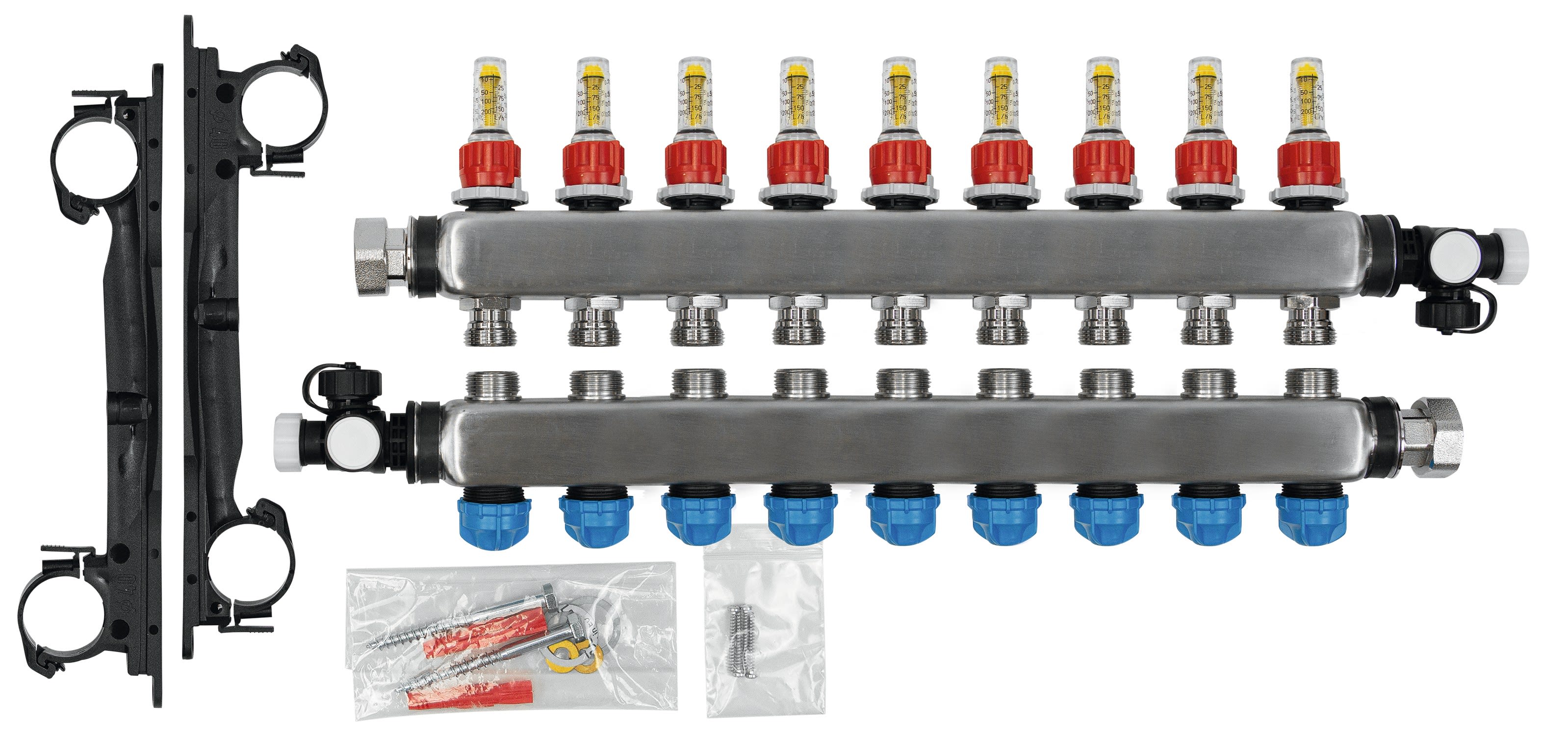 Collecteur gamme RMV pour tous les systèmes de plancher chauffant et systèmes de raccordement aux radiateurs. Collecteur en acier adapté à des hauteurs même les plus réduites. Raccordement de tubes jusqu'à 20 mm de diamètre