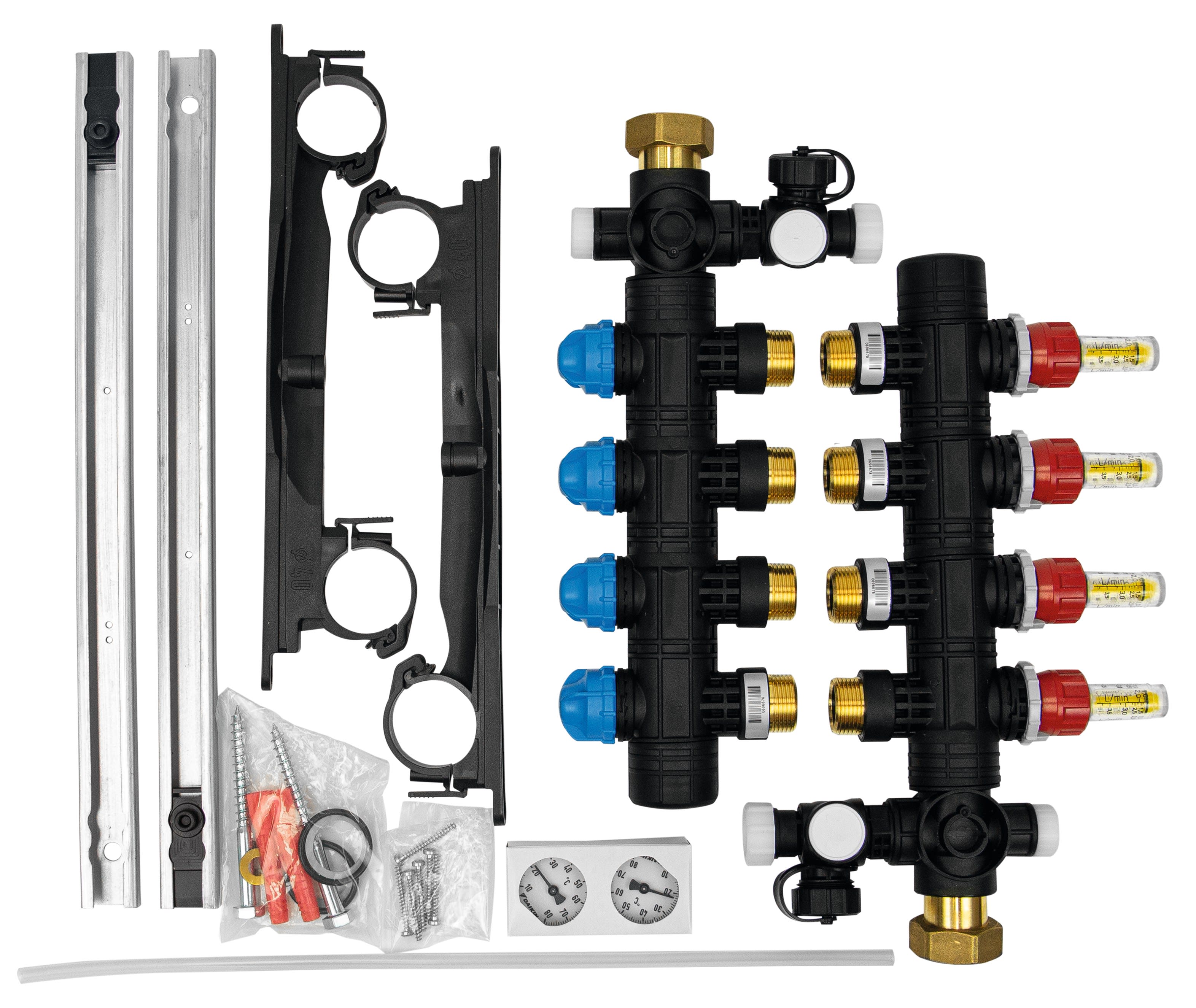 Collecteur gamme RMV pour tous les systèmes de plancher chauffant et systèmes de raccordement aux radiateurs. Collecteur en acier adapté à des hauteurs même les plus réduites. Raccordement de tubes jusqu'à 20 mm de diamètre