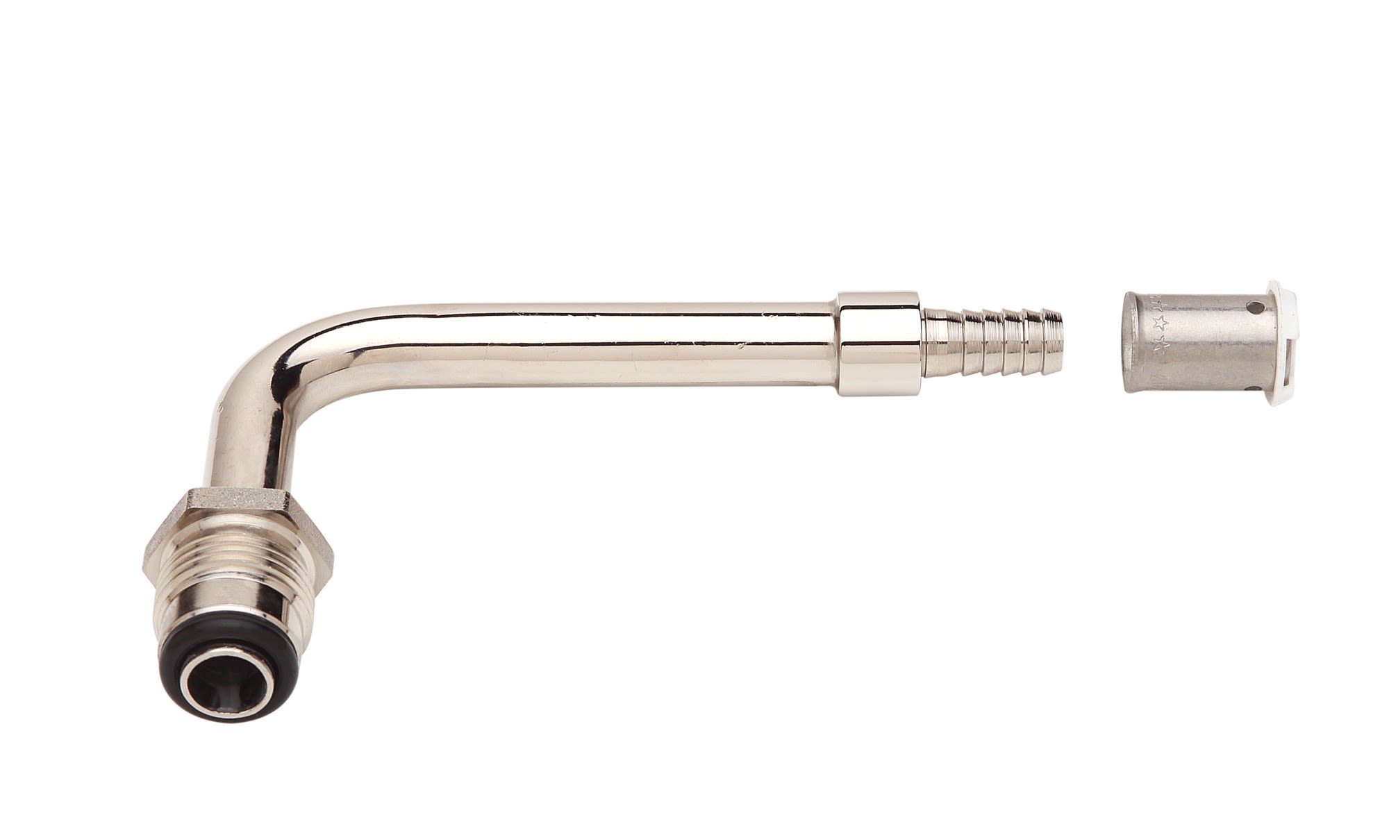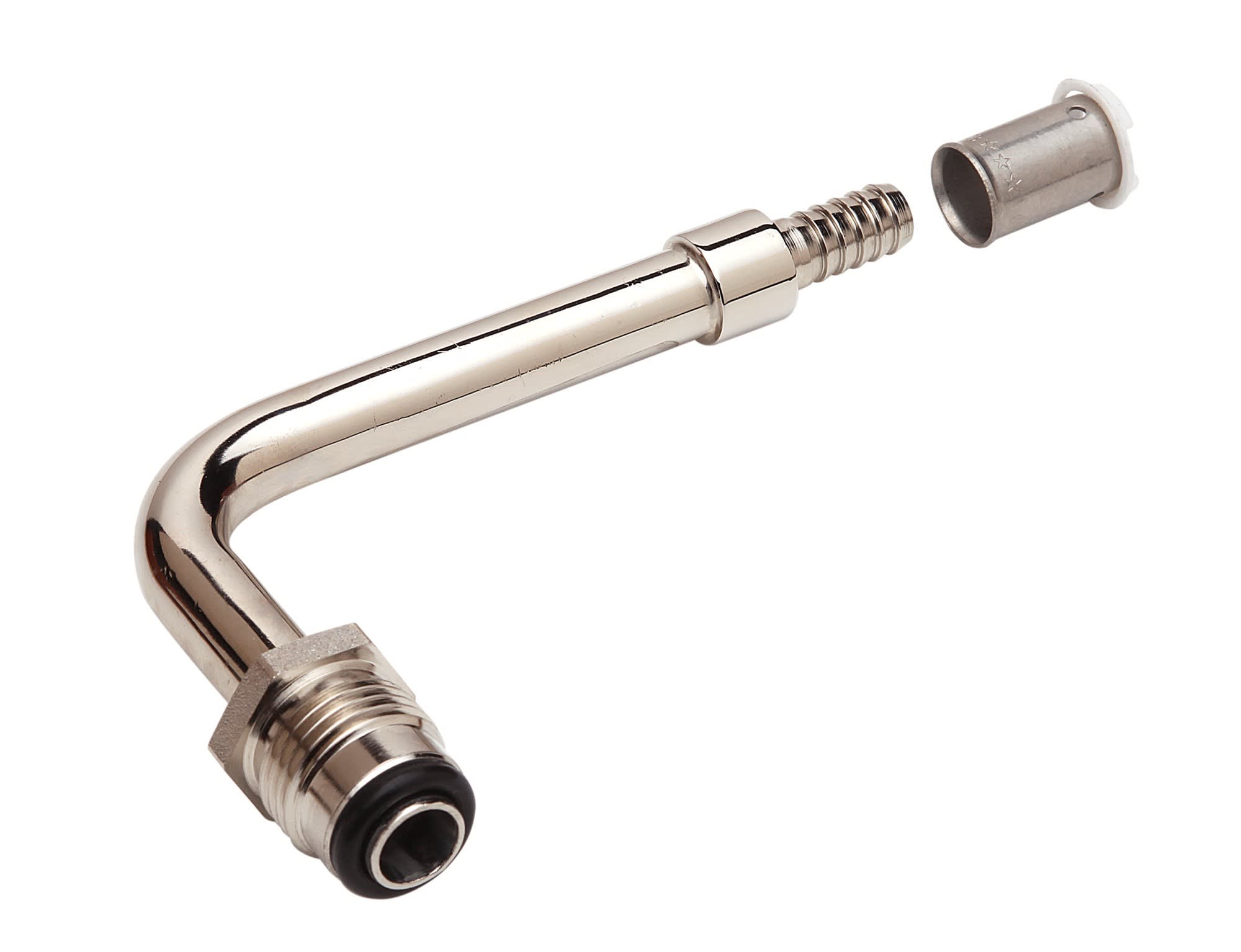 Coude rotatif 75mm pour tube PER16, à sertir. Permet de transformer un corps de vanne standard en corps hydrocablé