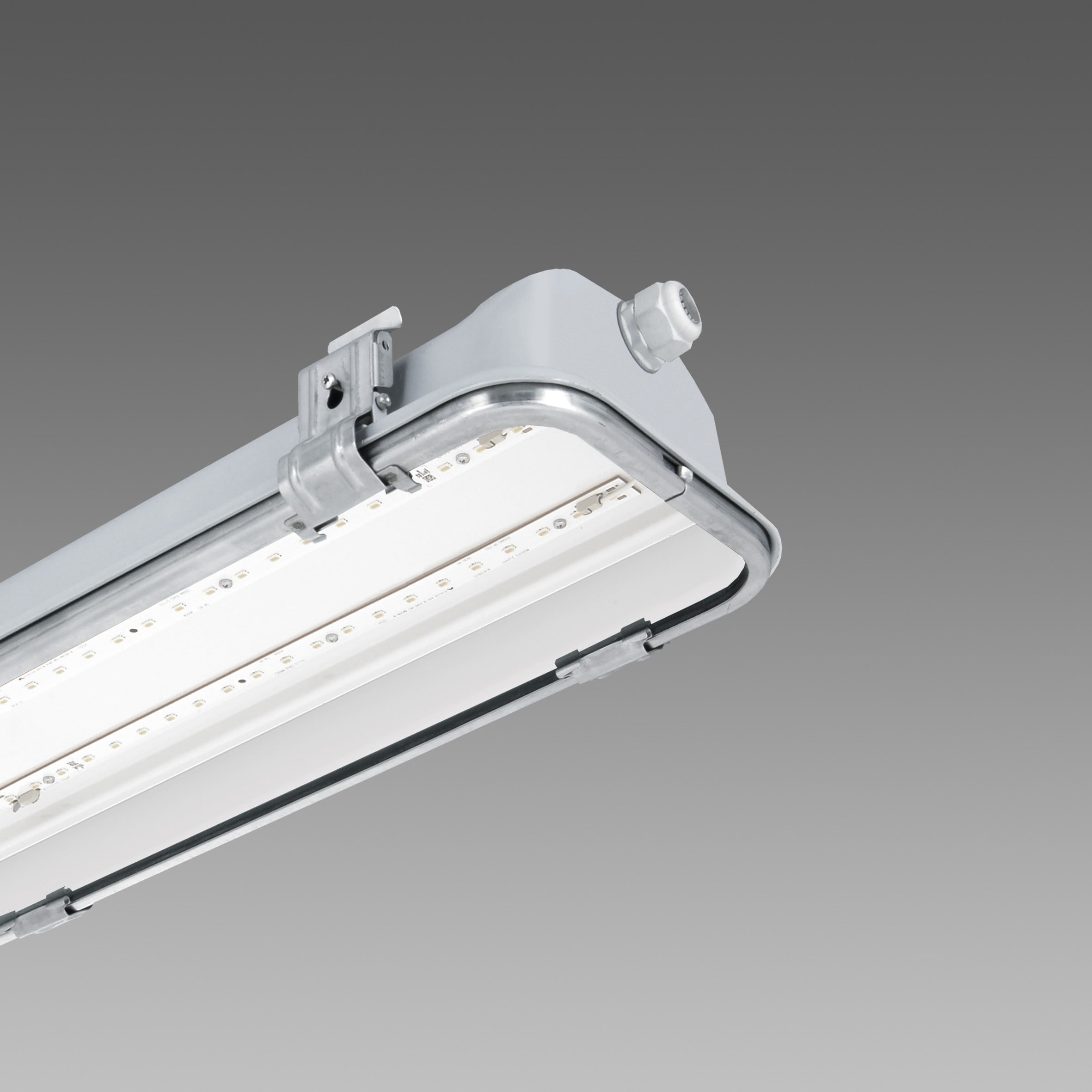 Le Forma est un étanche de haute qualité.Sa résistance est très importante.Son corps est en acier embouti monobloc à résistance mécanique élevée. Cadre en acier matricé, embouti dans un monobloc à résistance mécanique élevée.Les lentilles sont en PMMA haute performance, celles-ci résistent à haute température et au rayonnement UV, avec plusieurs distributions photométriques.Diffuseur : en verre trempé de 5 mm d'épaisseur, antichsoc.Peinture : pulvérisation avec peinture polyester couleur RAL 7035, résistant à la corrosion et aux brouillards salins.Équipement : joint en caoutchouc siliconique. Serre-câble en nylon f.v. Ø 1/2" gas (câble Ø 9 min et Ø 12 max). Système de fermeture en acier. Piton à tige filetée de série. Installable sur ligne art. 6000 à l'aide de l'acc. 6036.Normes : appareils conformes aux normes EN60598-1 CEI 34-21 en vigueur et présentant un niveau de protection IP65IK08 selon les normes EN 60529.Le luminaire remplit les critères exigés par les référentiels IFS et BRC, démarche hsACCP, pour les systèmes d'éclairage dans les industries alimentaires.Dans tous les cas, vérifier avec les designers et avec le service conseil de Disano la compatibilité entre le matériau et les aliments dans toutes les industries comportant un système de nettoyage et lavage.En version LED ou non LED.